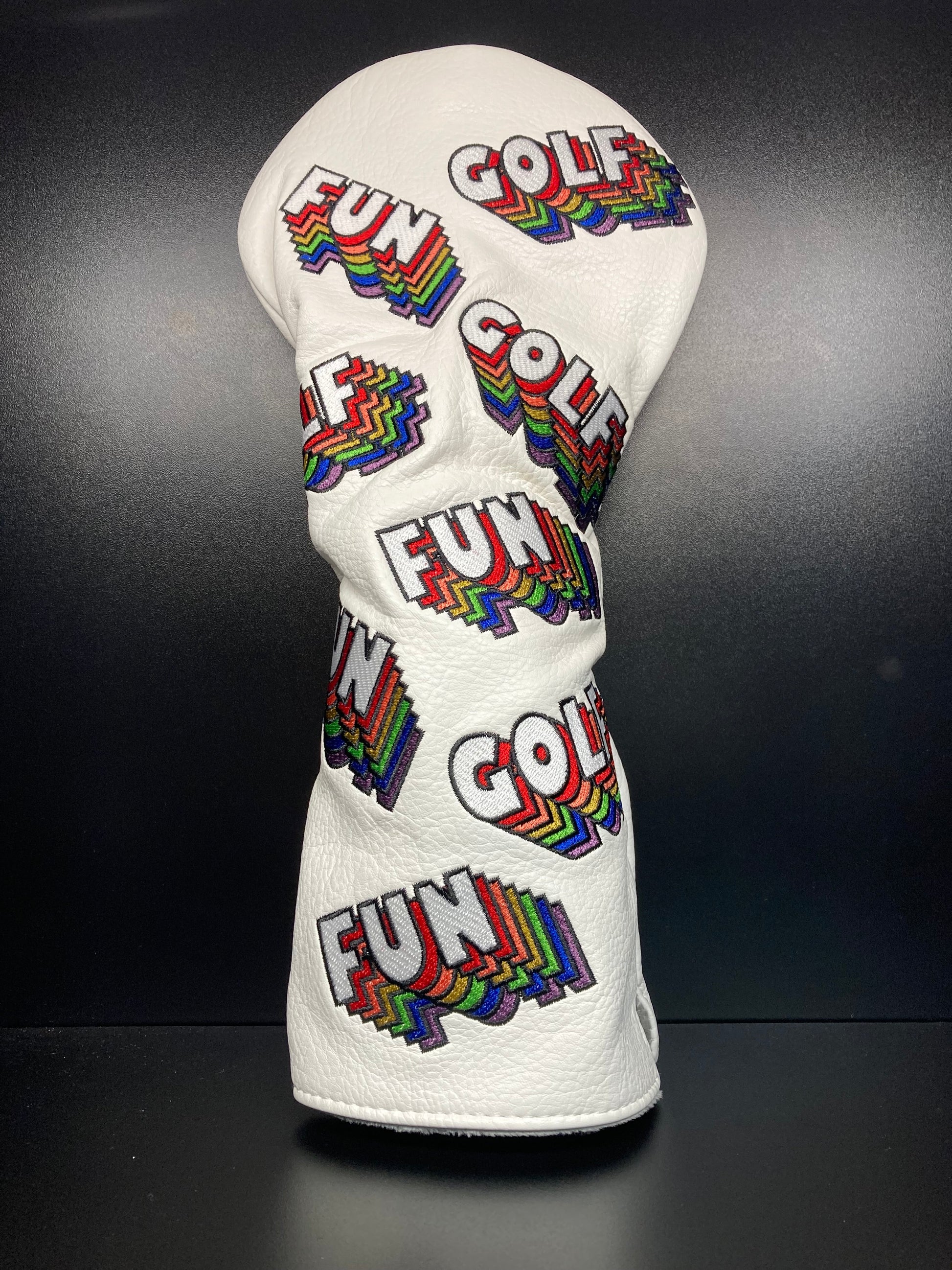The Arcade Fun Golf Headcover with dimensions 14"L X 6"W is a vibrant and nostalgic accessory for your golf bag, reminiscent of classic arcade games.