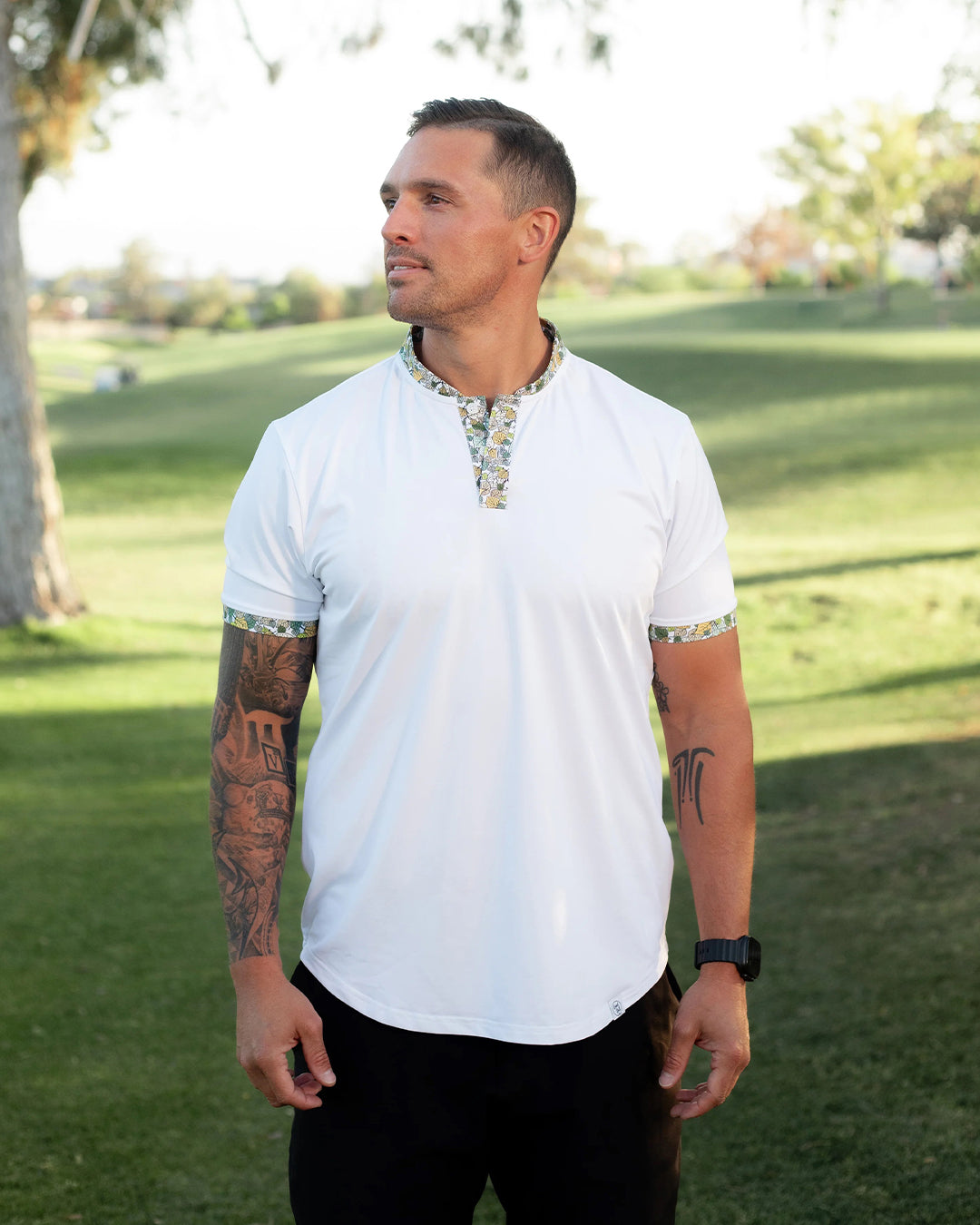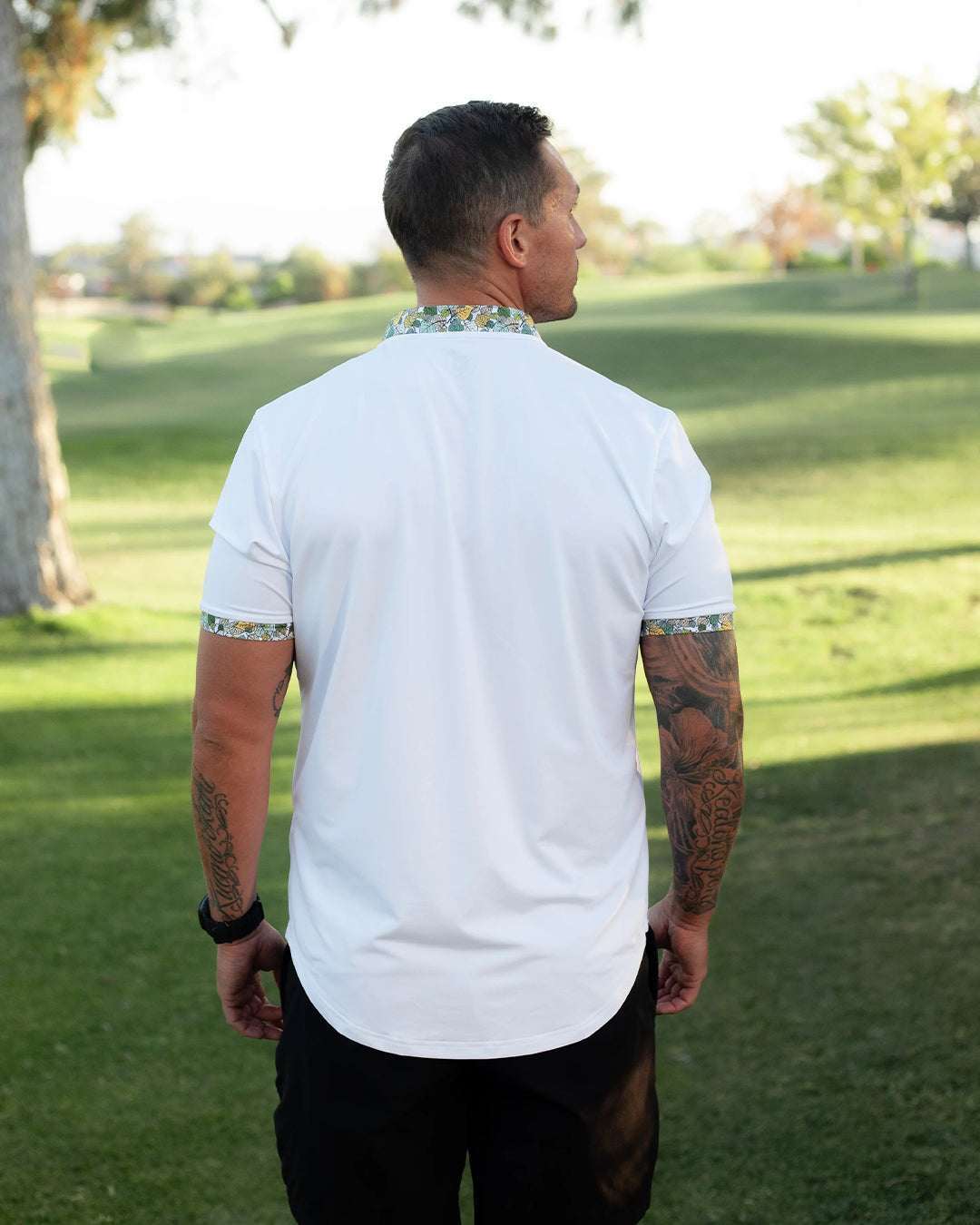 The Aspen Air Polo features a pure white base accented by a warm toned aspen leaf design ensuring you look good long after the leaves fall from the trees.