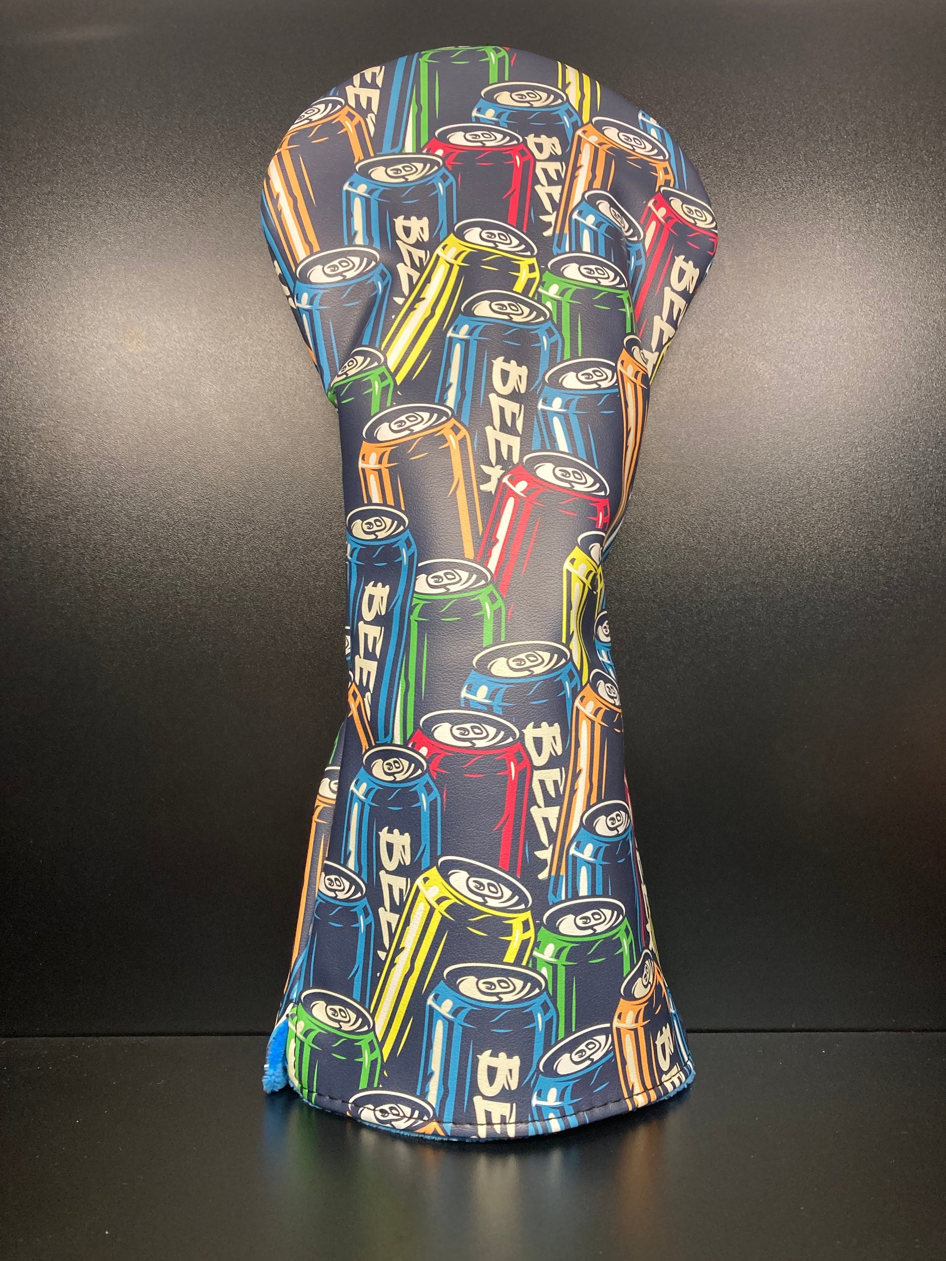 Crafted to fit most standard-sized golf club heads, this headcover likely features a collage-style design comprised of various beer can images. Each beer can may showcase different brands, logos, or colorful designs, creating a dynamic and eye-catching pattern across the headcover.