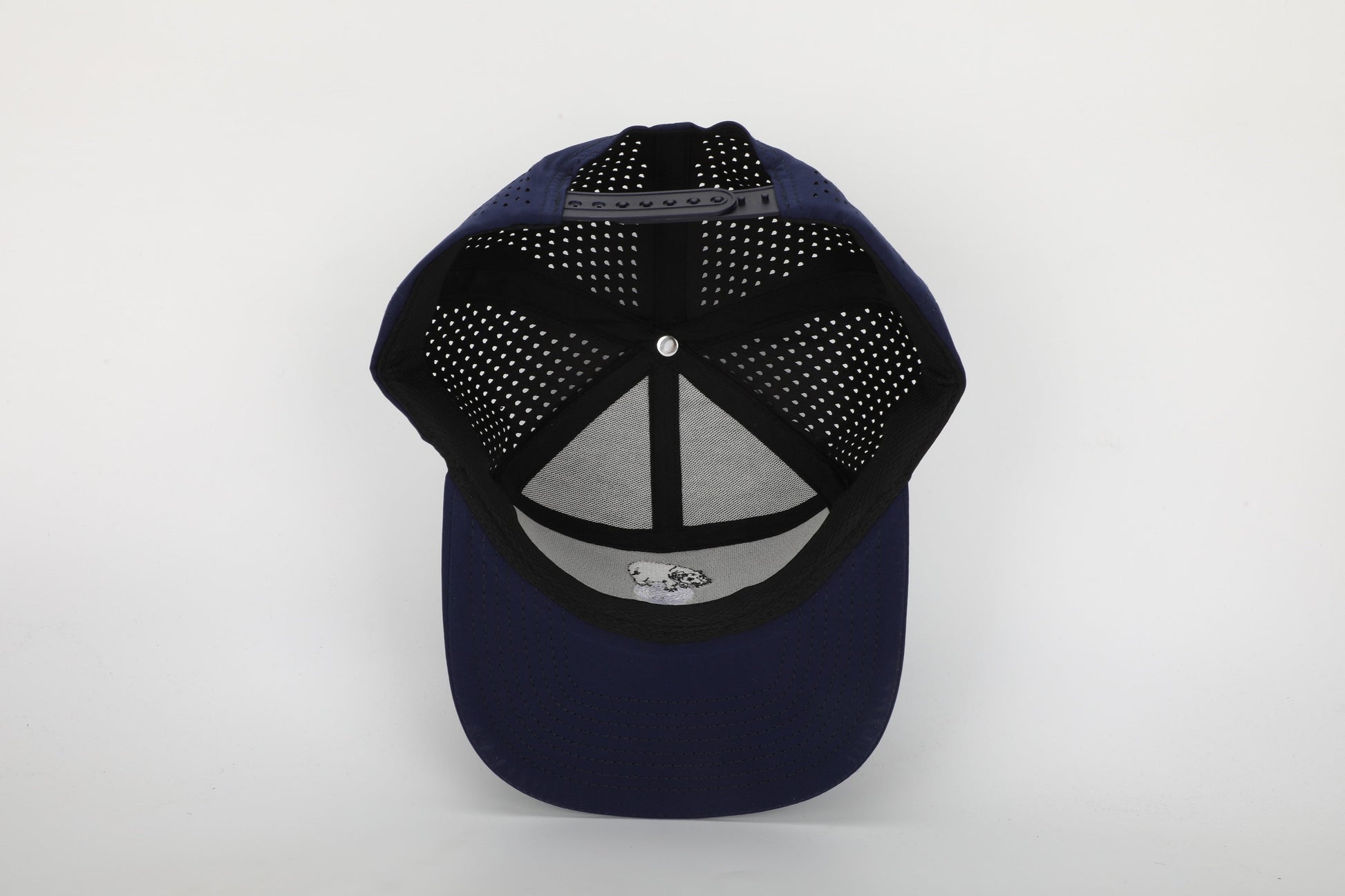 6 panel laser cut hole hat in color blue! Adjustable snapback made to fit all sizes! Made out of 90% polyester and 10% spandex material.