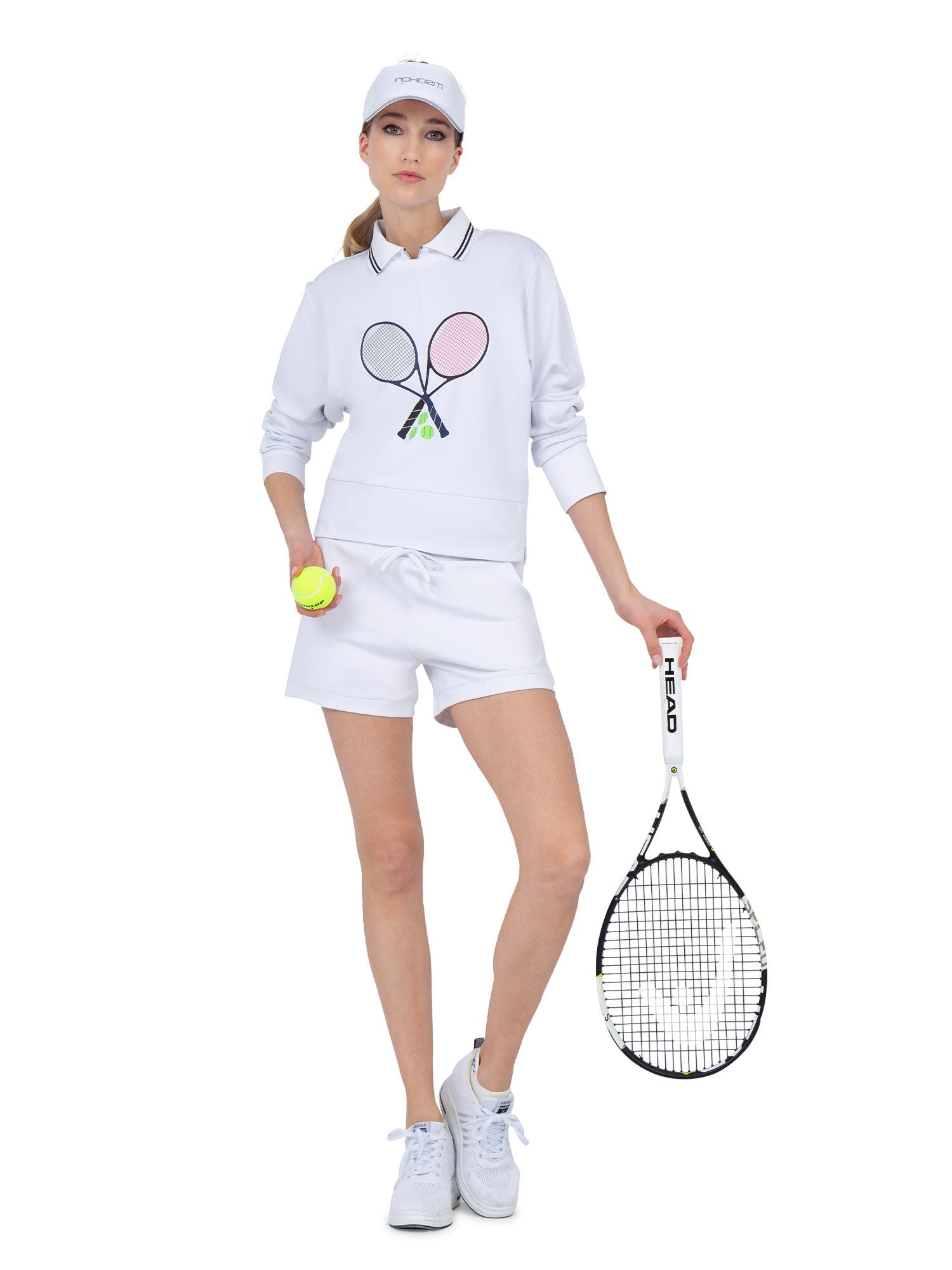Gear up for your next pickleball match or elevate your everyday look with the Camila Performance Sweatshirt. This relaxed-fit sweatshirt boasts a UPF 50+ rating, providing exceptional protection against harmful ultraviolet rays, whether you're crushing aces on the court or lounging around in style.Relaxed fit for optimal comfort UPF 50+ rating for sun protection Four-way stretch for unrestricted movement Soft, luxurious performance fabric Eye-catching pickleball racket print Machine washable and easy care Sustainable blend of recycled materials - 67% recycled rayon, 28% nylon, and 5% spandex. This blend offers the perfect combination of softness, breathability, and long-lasting durability.