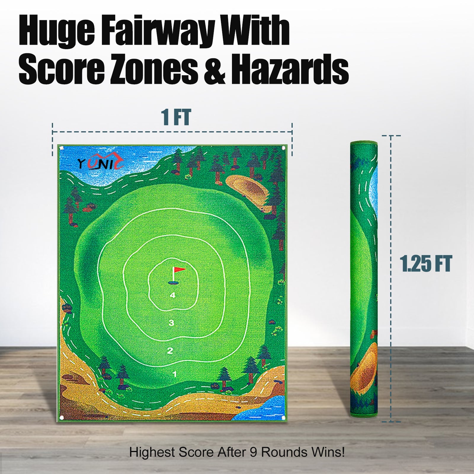 ⛳️Set up your game anywhere with the 4 x 6 ft Chip N' Stick Mat. Its portable, high-quality design resembles a real putting green, ensuring effortless setup and storage.