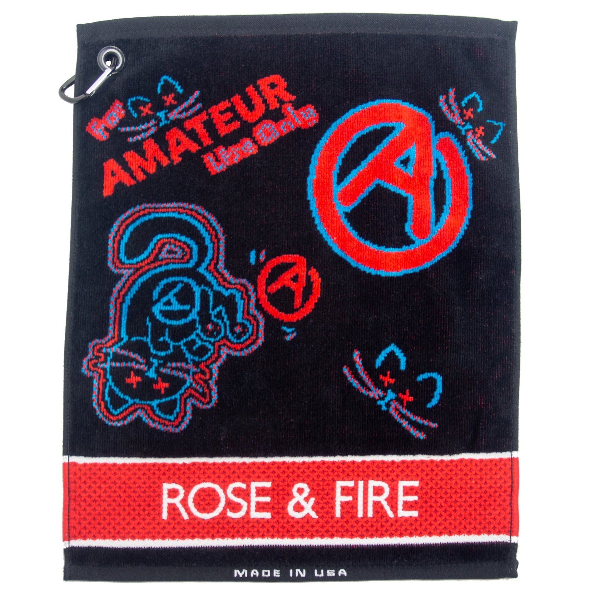 The Cool Cat Circle A design makes a statement on the course. This plush towel has a "honeycomb" weave banner around the "ROSE & FIRE" script at the bottom for more abrasive club cleaning. It also features a solid brass grommet and sturdy carabiner for fast and secure attachment.