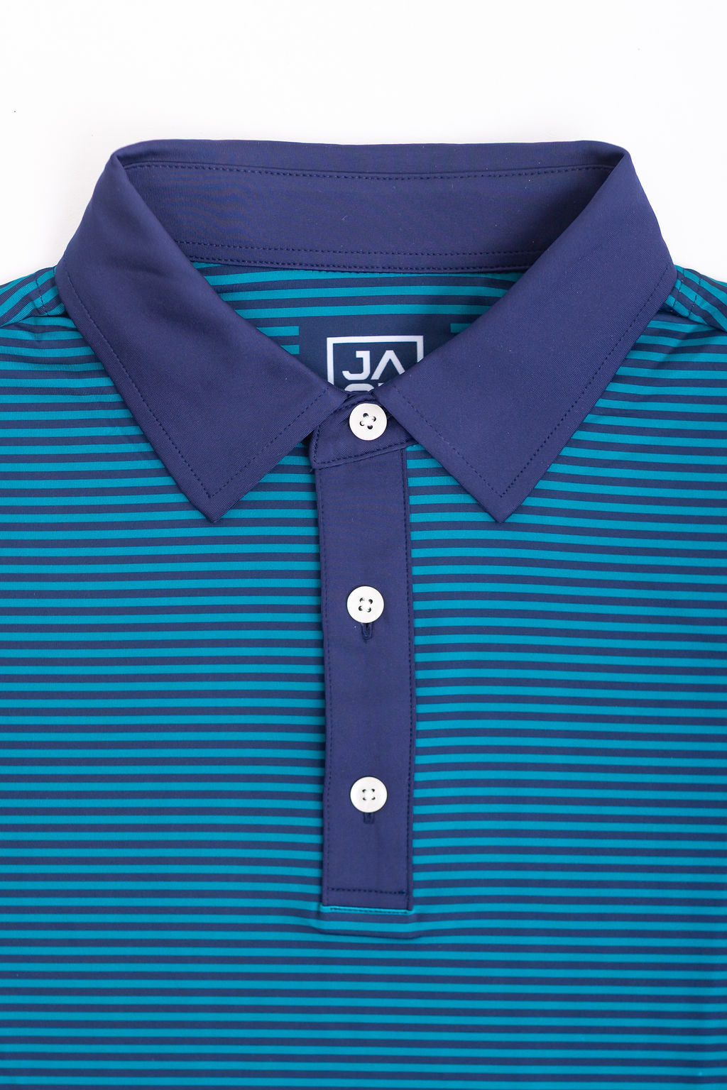 Bold and refined, the Coral Polo brings a fresh energy to your game. Featuring vibrant teal and navy horizontal stripes, this polo stands out with a clean, modern design. The solid navy collar and placket provide a sharp contrast, while the lightweight performance fabric ensures breathability and comfort from the first tee to the clubhouse. Whether you’re chasing birdies or just soaking up the sun, this new arrival is your go-to for effortless style on and off the course.