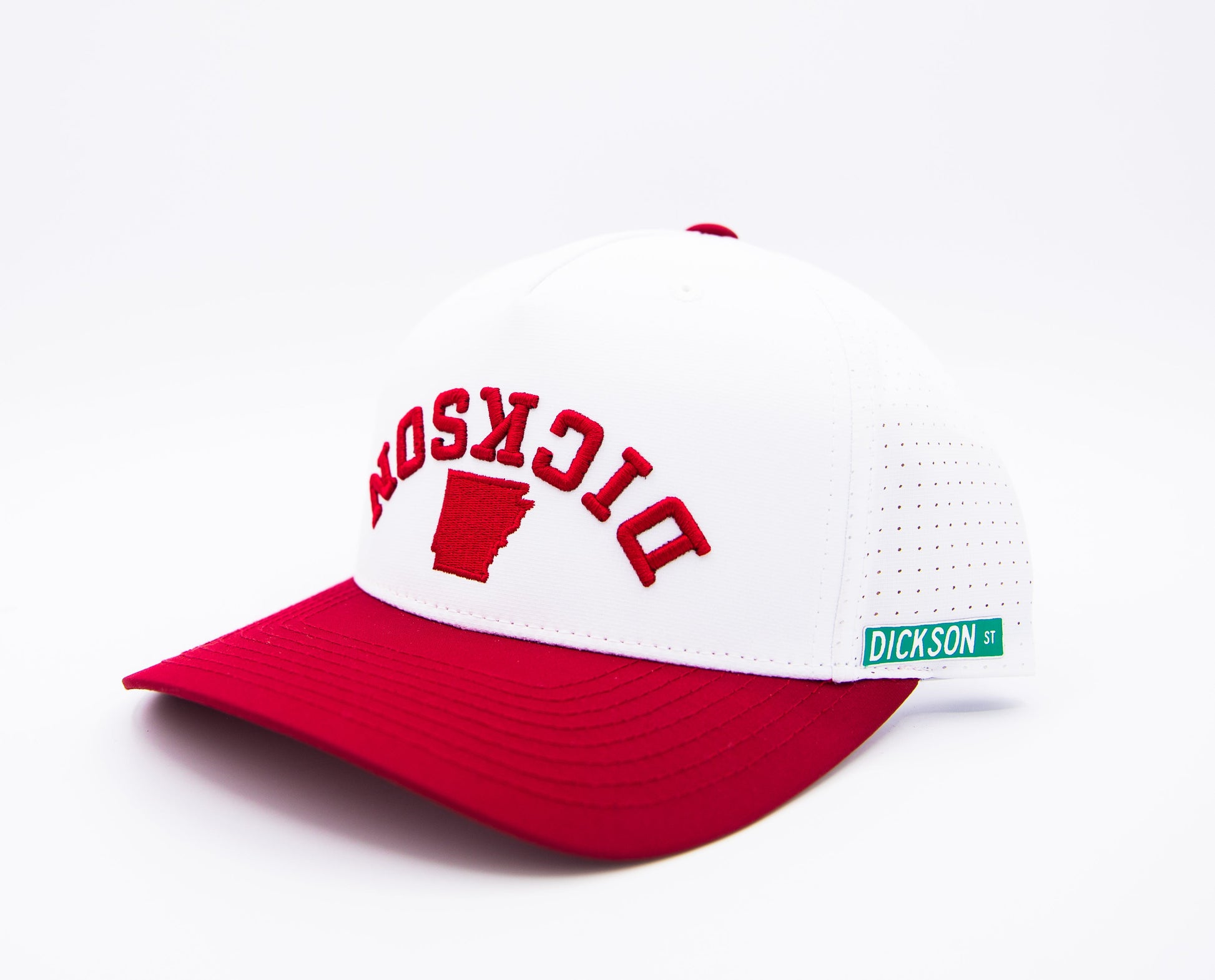 - Mismatched white and red snapback closure