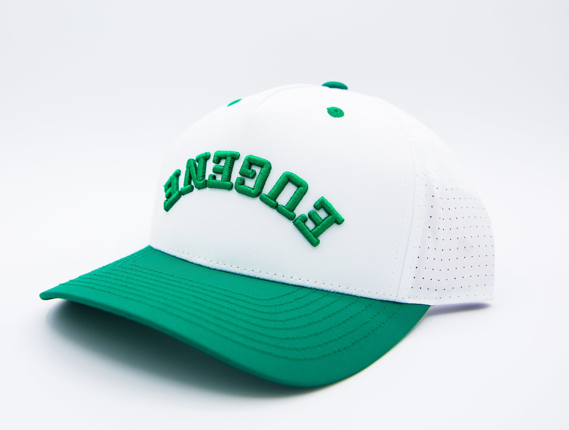 - Mismatched green and white snapback closure