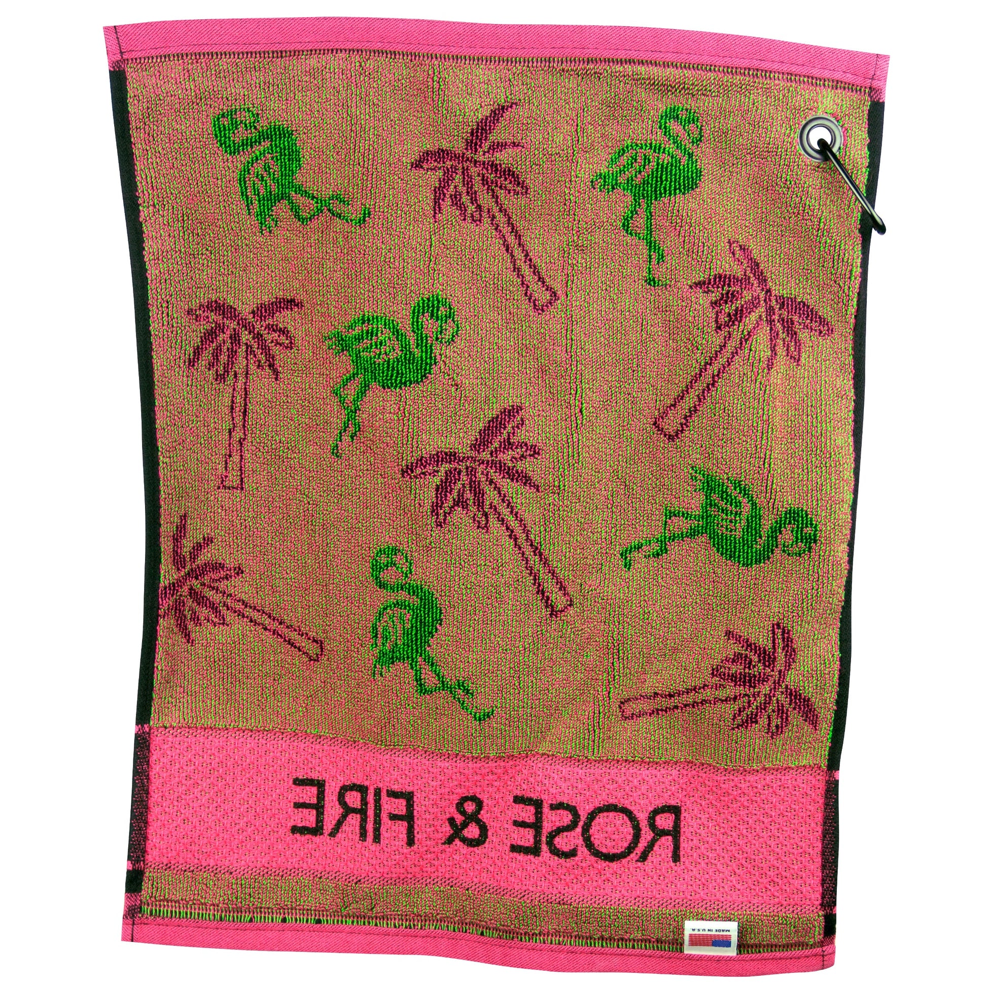 The fun flamingo and palm tree design makes a statement on the course. This plush towel has a "honeycomb" weave banner around the "ROSE & FIRE" script at the bottom for more abrasive club cleaning. It also features a solid brass grommet and sturdy carabiner for fast and secure attachment.