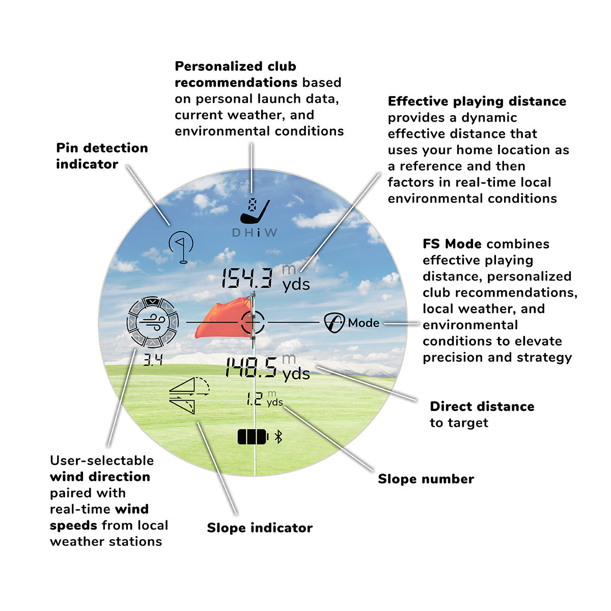 Get personalized club recommendations based on the distance to the pin determined by laser, your personal launch data, real-time weather, and environmental conditions - all factored into the AI's smart club recommendations