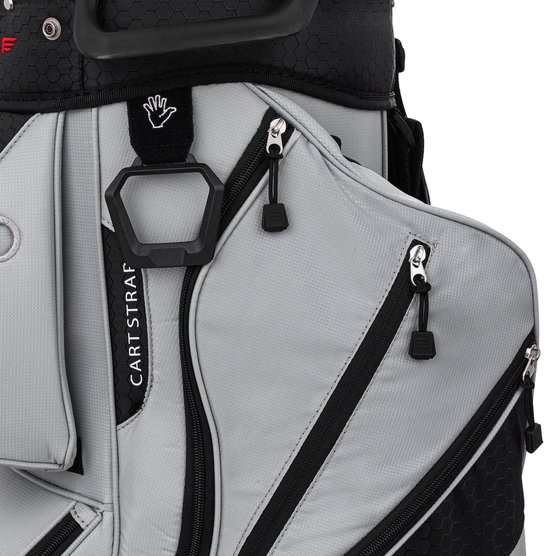- High Quality lightweight construction: This cart bag comes with a large, reinforced and sturdy base and several handles to make lifting your clubs out of the trunk and onto your cart a breeze. The bag comes with 2 integrated side grab handles and a bottom handle built into the cooler pocket. It also has a rear grab handle and a tuck away padded carry strap. The Cart Bag also includes a strap channel to secure your bag and clubs to your cart.
