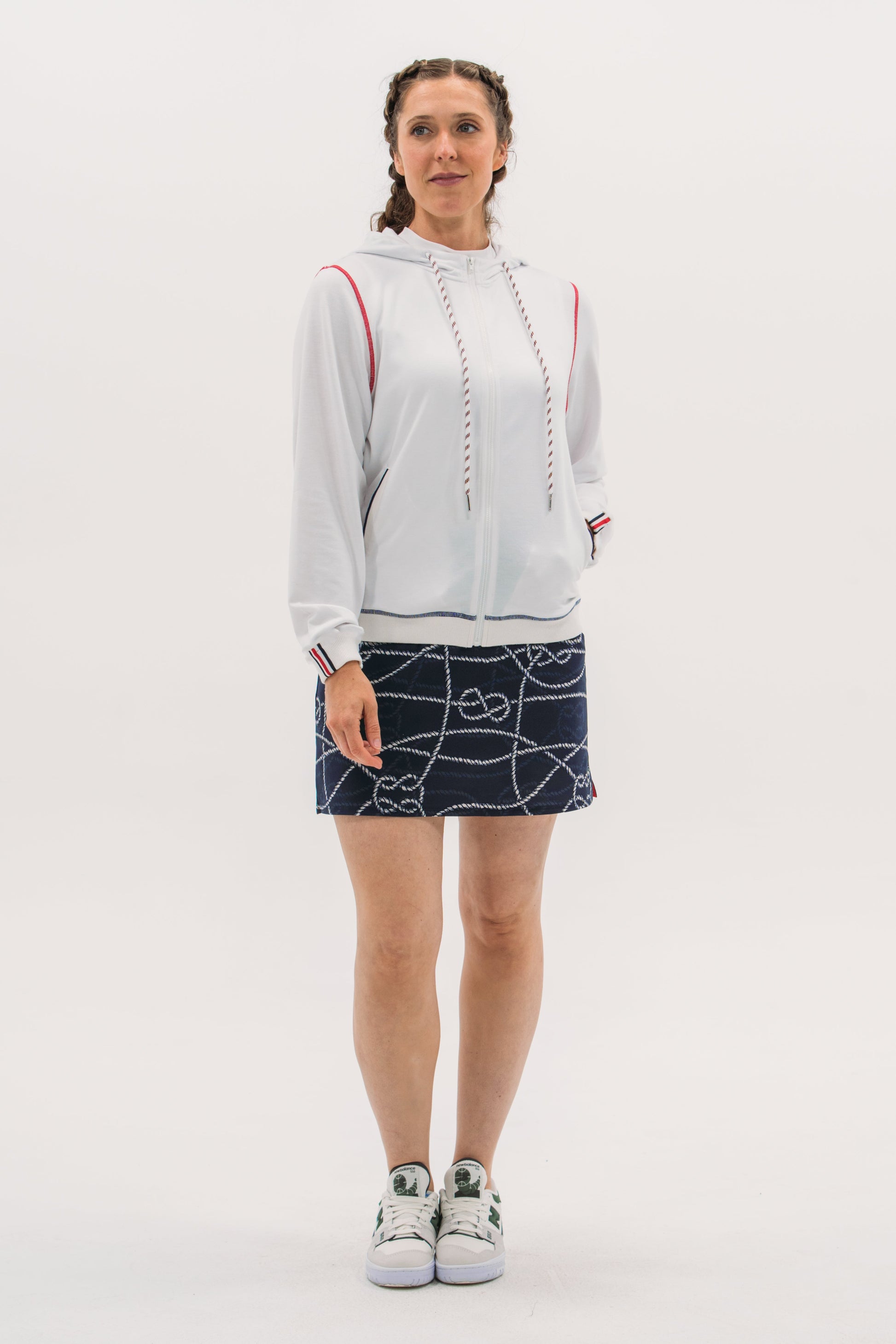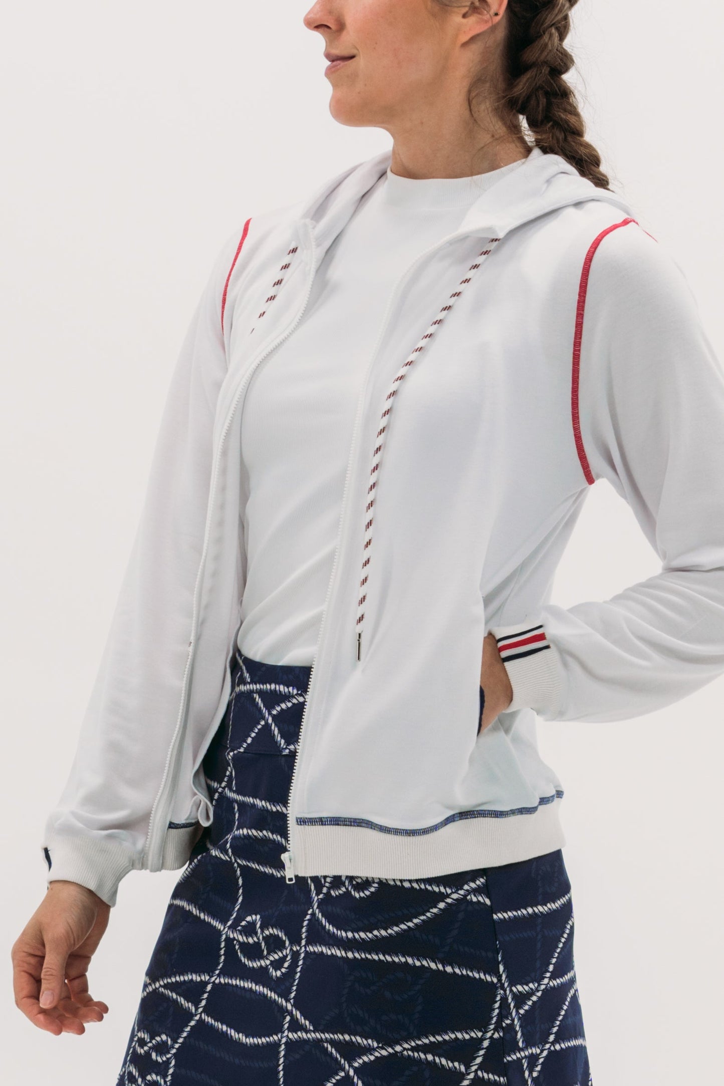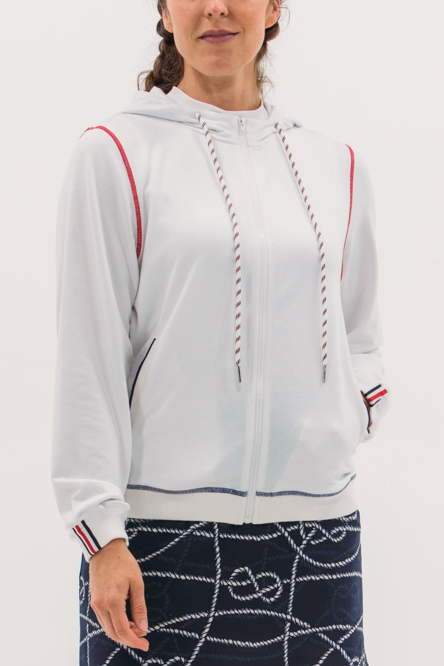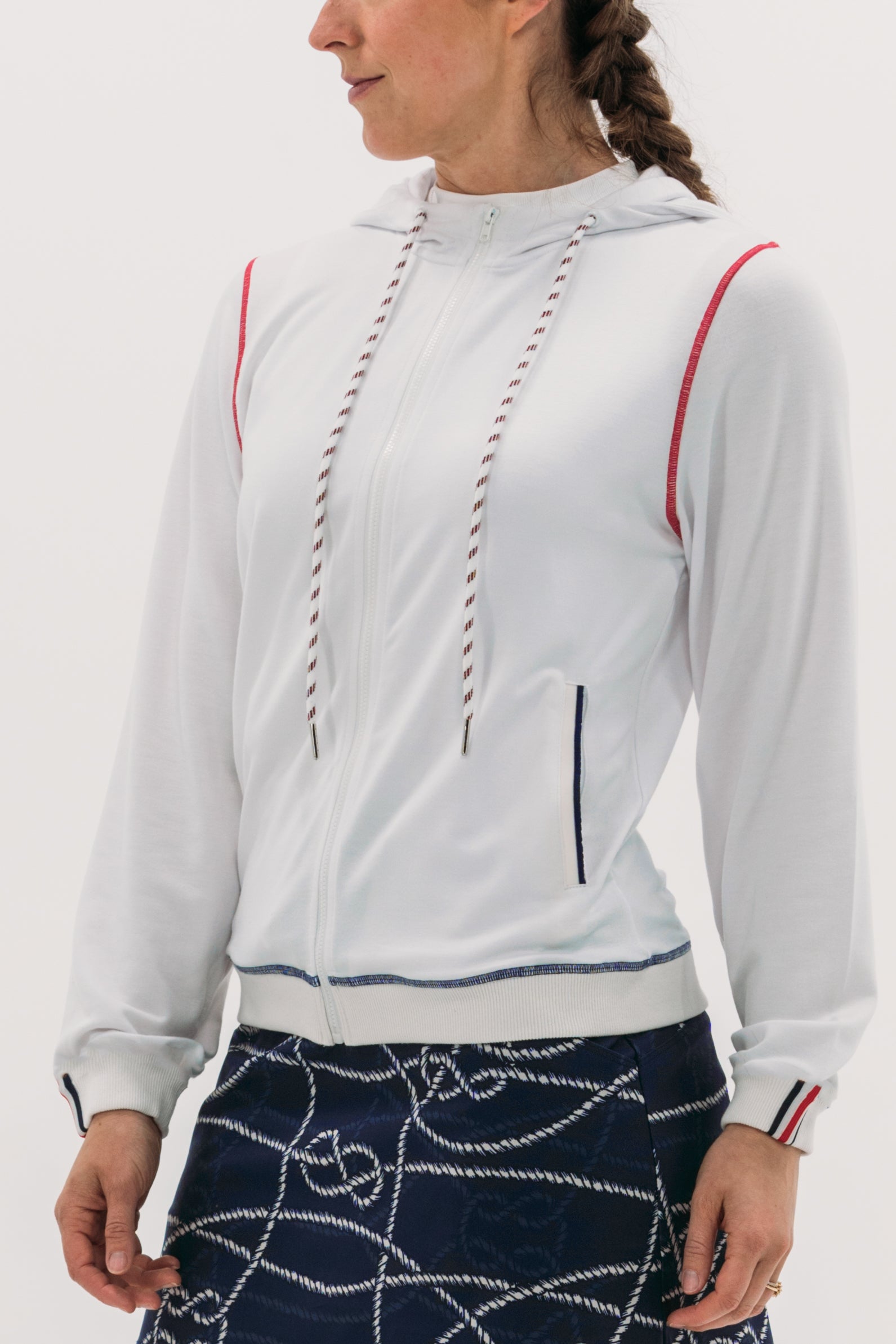 Cut for a relaxed fit from ULTRA-LIGHTWEIGHT loop-back French terry, this full-zip pullover hoodie will be your go-to cozy piece for the season. Contrast stitching and striped drawstrings elevate this piece beyond a beautifully made basic.