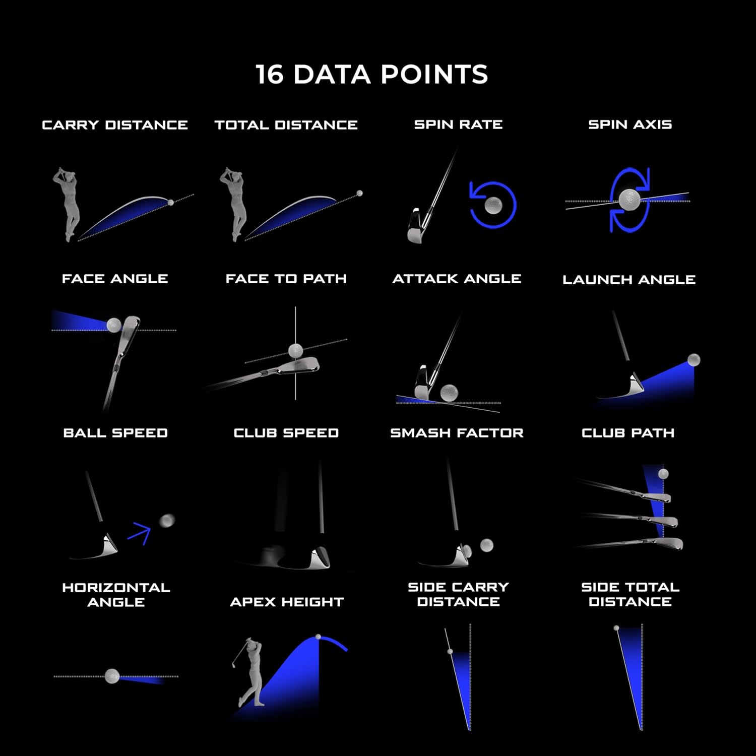 - 16 Points of Club & Ball Data Included-Carry Distance-Total Distance-Spin Rate-Spin Axis-Face Angle-Face to Path-Attack Angle-Launch Angle-Ball Speed-Club Speed-Smash Factor-Club Path-Horizontal Angle-Apex Height-Side Carry Distance-Side Total Distance