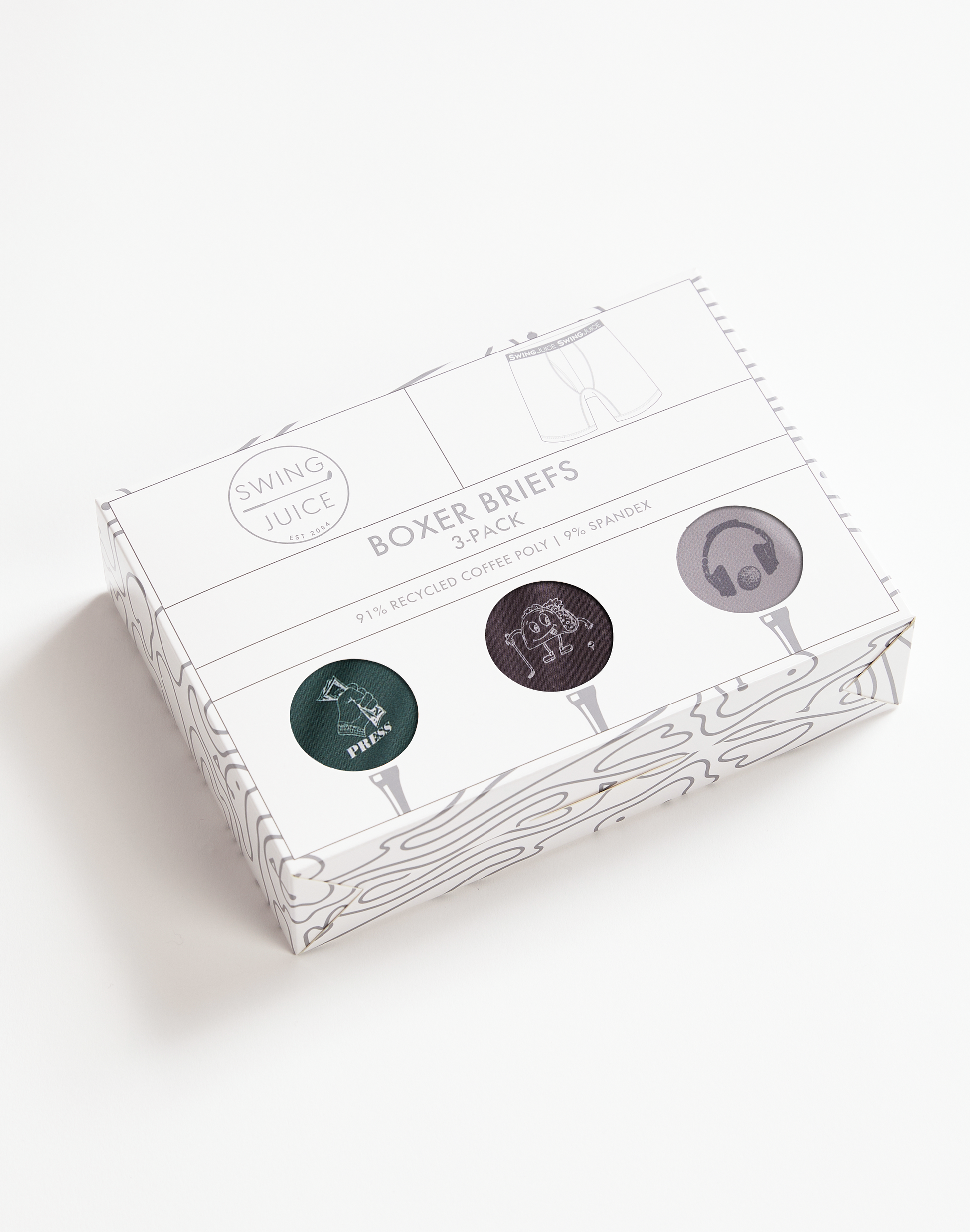 Experience unparalleled comfort with the Golf 6" Boxer Brief 3-Pack Core. Designed with a fly pouch and super stretch for performance sports, these boxer briefs are crafted from moisture-wicking and odor-busting S.Café® eco-friendly fabric. This pack includes our most popular designs: Golf Press, Golf & Tacos, and Golf & Hip Hop.