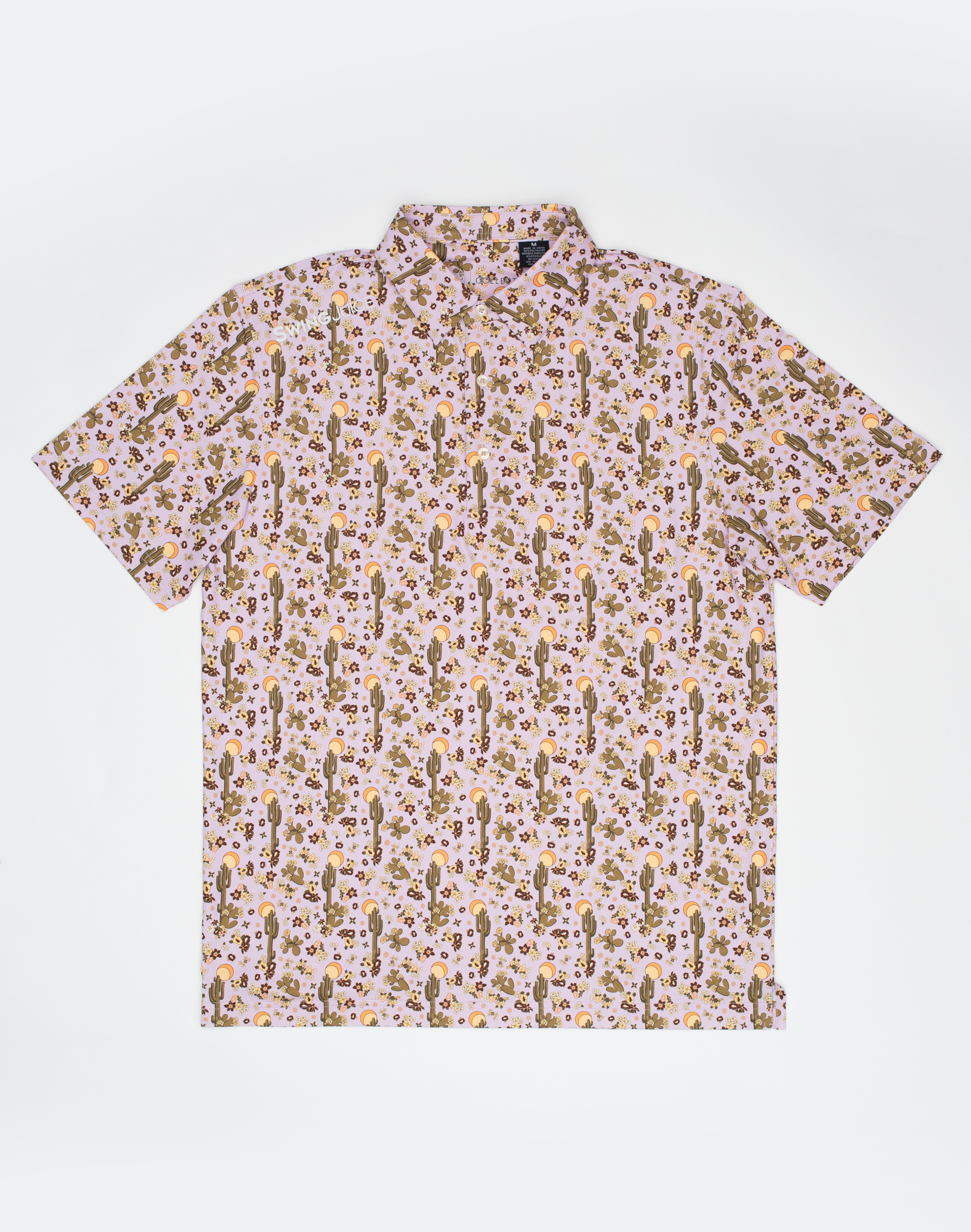 Embrace the serene beauty of the desert with the Golf Desert At Dawn Men's Polo from SwingJuice. Featuring a unique cactus print that captures the desert in full bloom, this polo brings a vibrant twist to your golf wardrobe. Designed for both style and performance, it’s perfect for a day on the course or a casual outing, offering a comfortable fit and breathability with a touch of southwestern charm.
