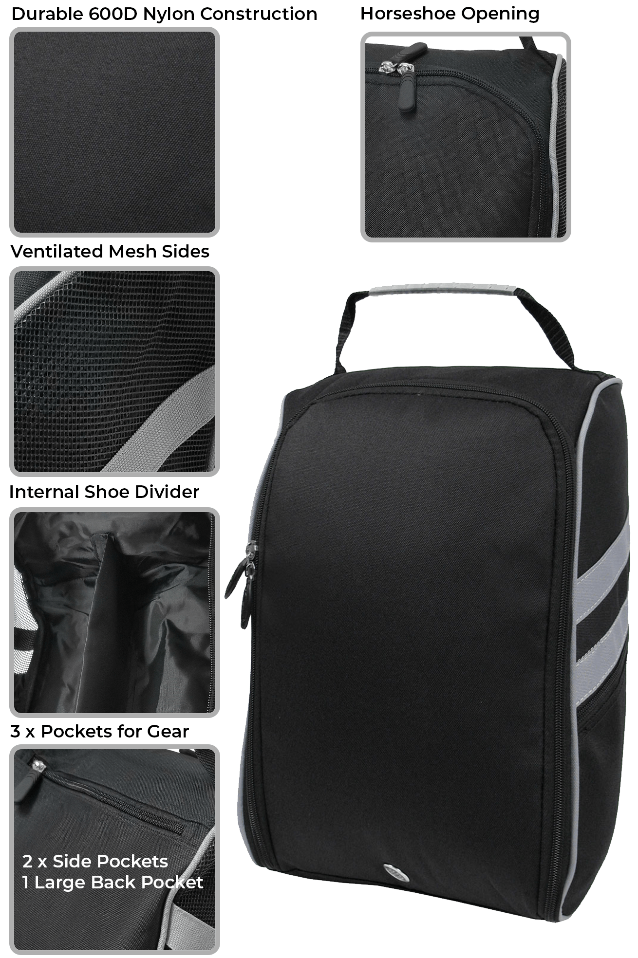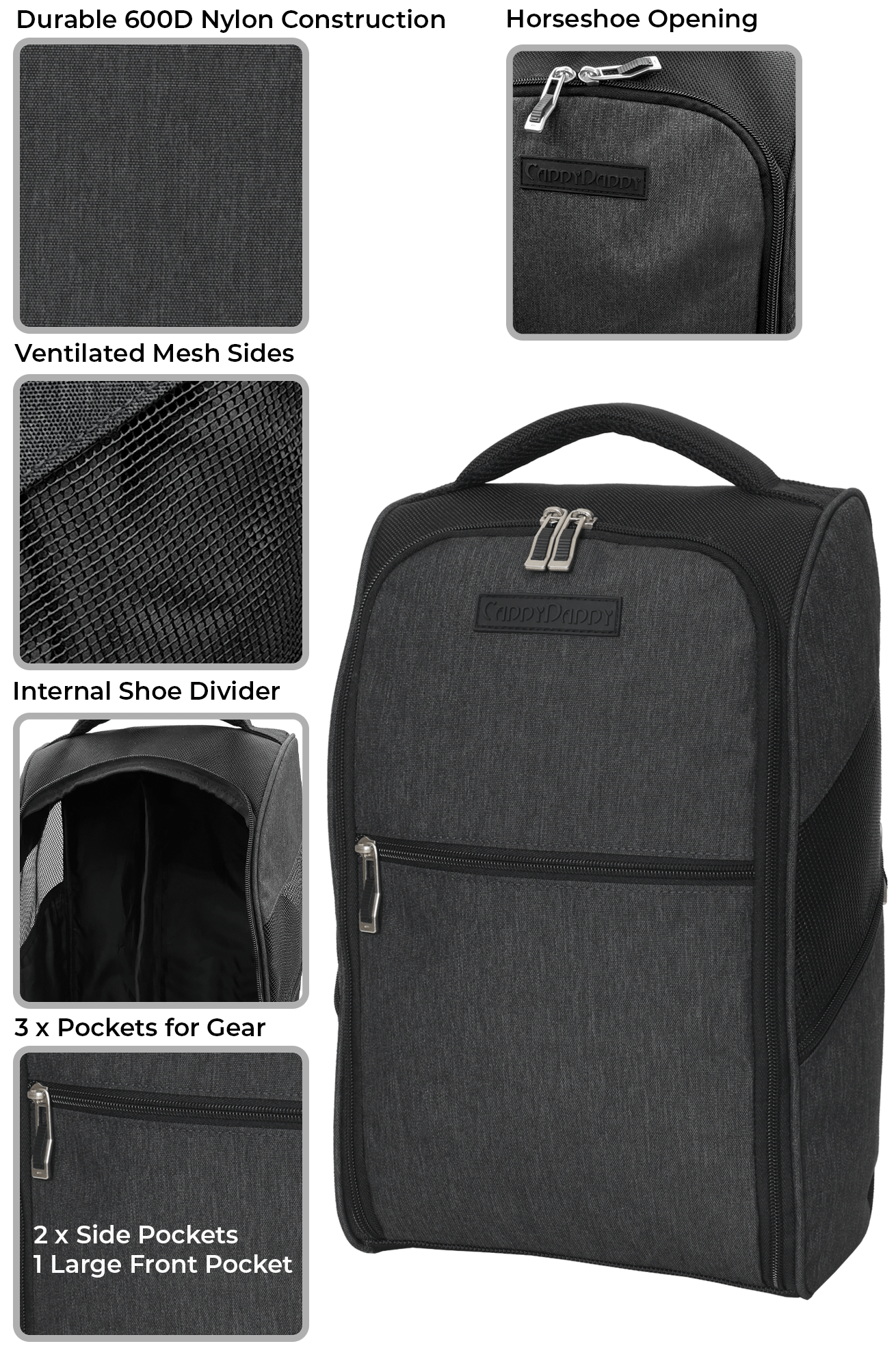 CaddyDaddy shoe bags are the perfect way to keep your golf shoes scuff free while transporting essential golf accessories. The large side pockets have plenty of room for golf balls, tees, gloves, divot tools and more. There’s even extra room for range finders or other accessories. The oversized back pocket on the Modern Shoe Bag can even carry a box of a dozen golf balls.