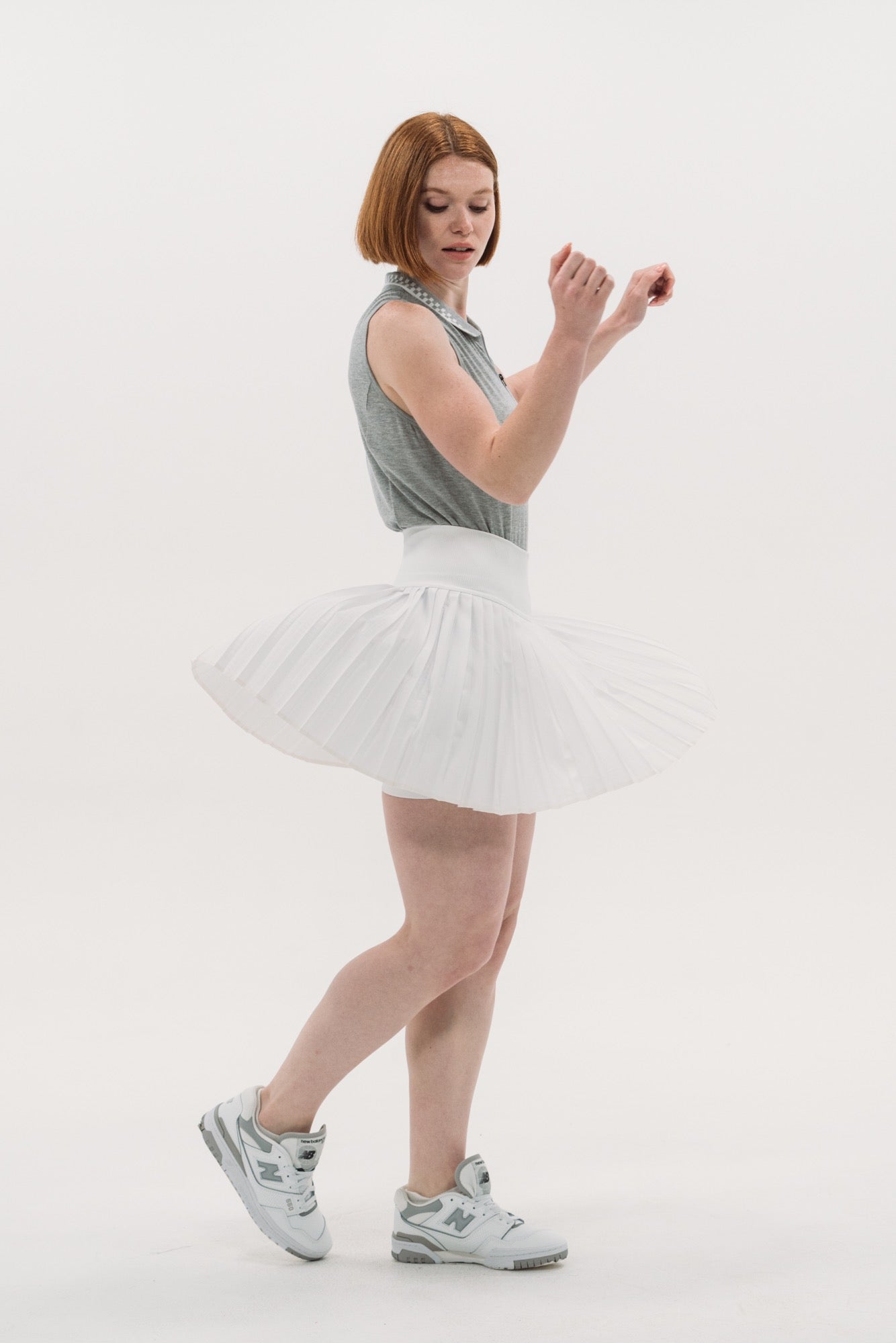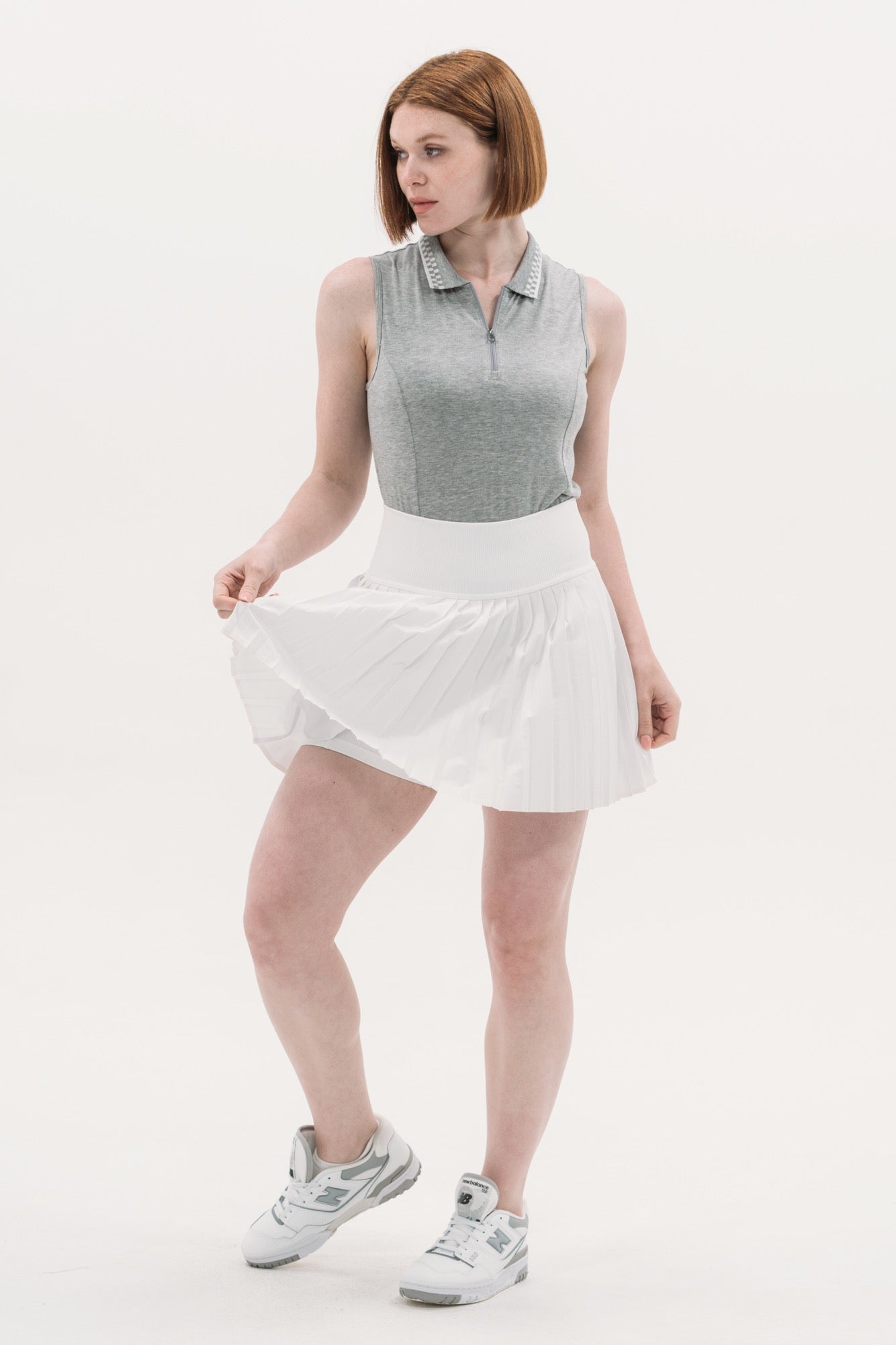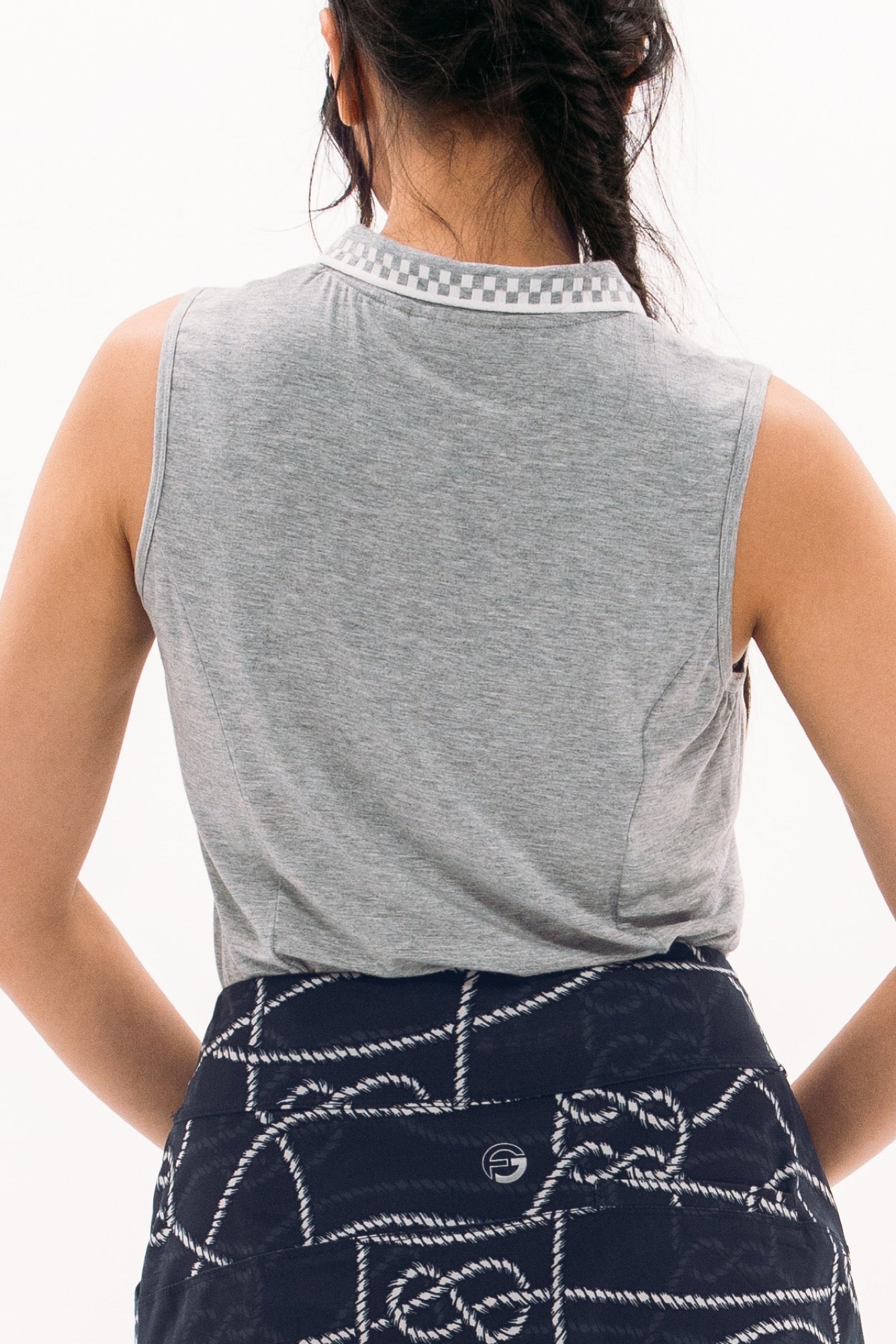 Made from lightweight technical grey-marl jersey, we're bringing back another of our most loved sleeveless polo shapes. With a hidden zip front placket and princess seam construction that flatters all body shapes, she's designed to fit today's sport chic demands. Topped with a cool, engineered-check knit collar, this piece is easy to pair back to anything you can throw at her.