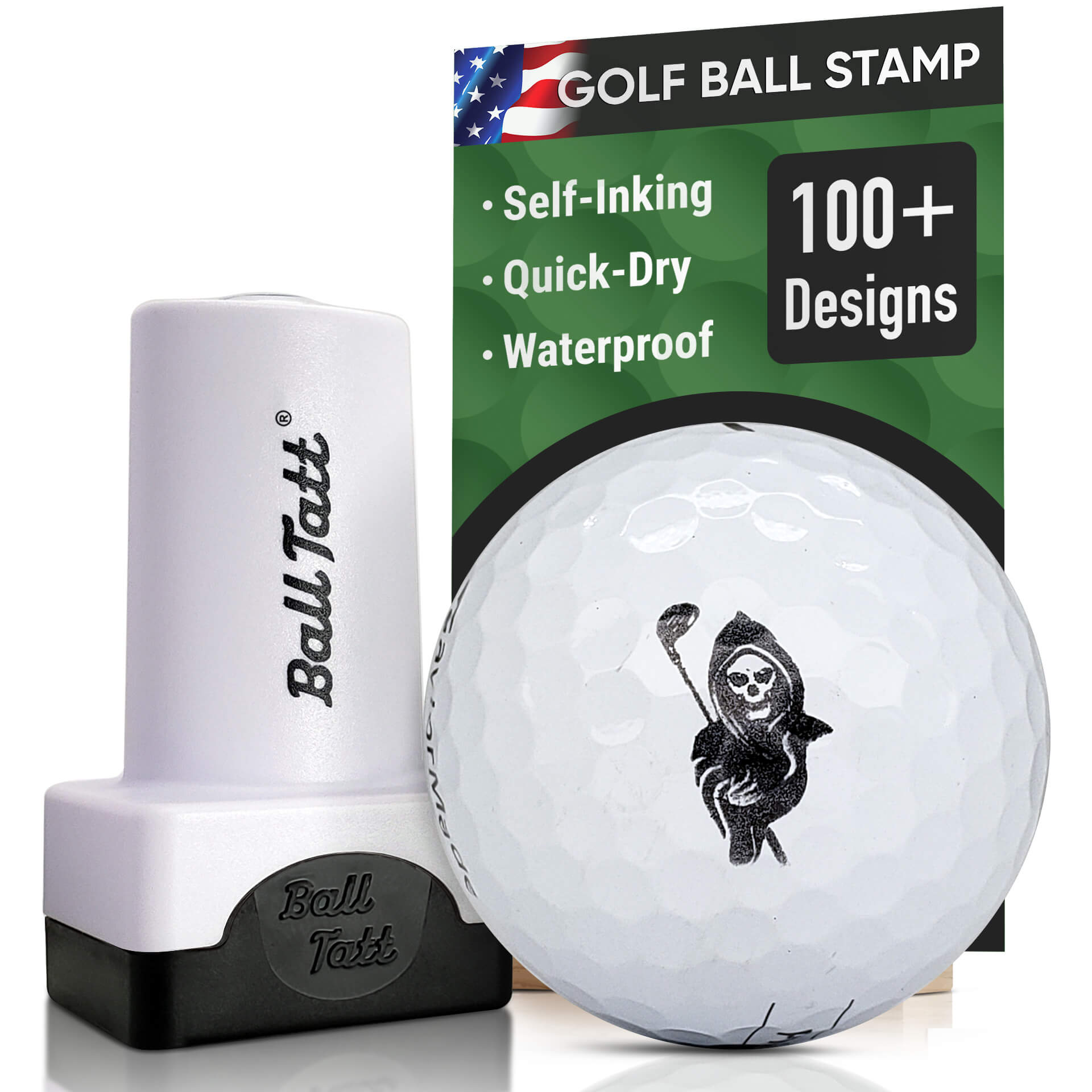 Stamp on and stand out with BALL TATT. Our large self-inking golf ball stamp offers clearly visible marking, while the fast-drying formula delivers smudge-free, long-lasting waterproof and fade proof imprints. No messy refills required and enough ink to last the season. Choose a from our great selection of designs.