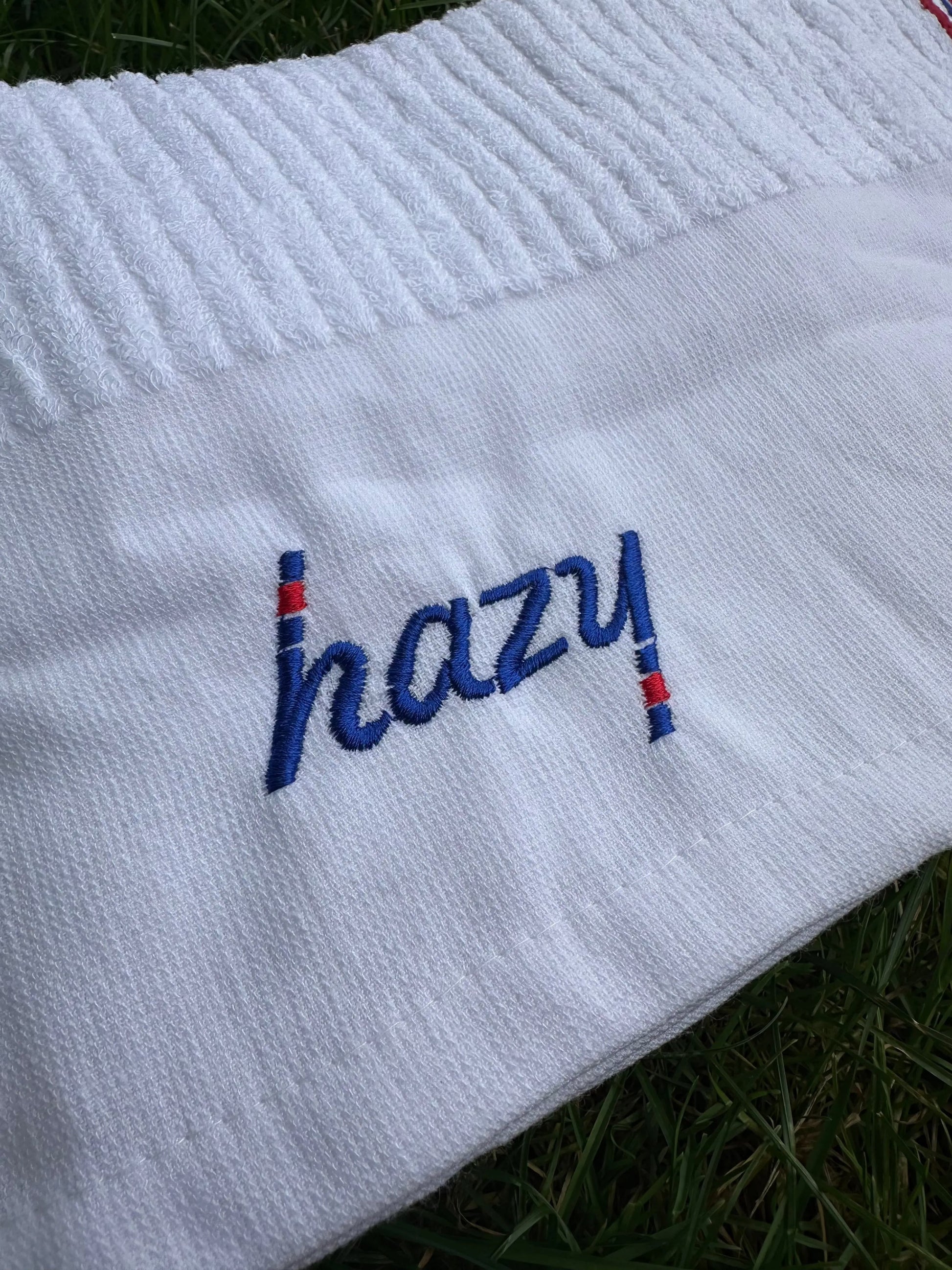 White premium cotton ribbed caddy towel with embroidered hazy logo