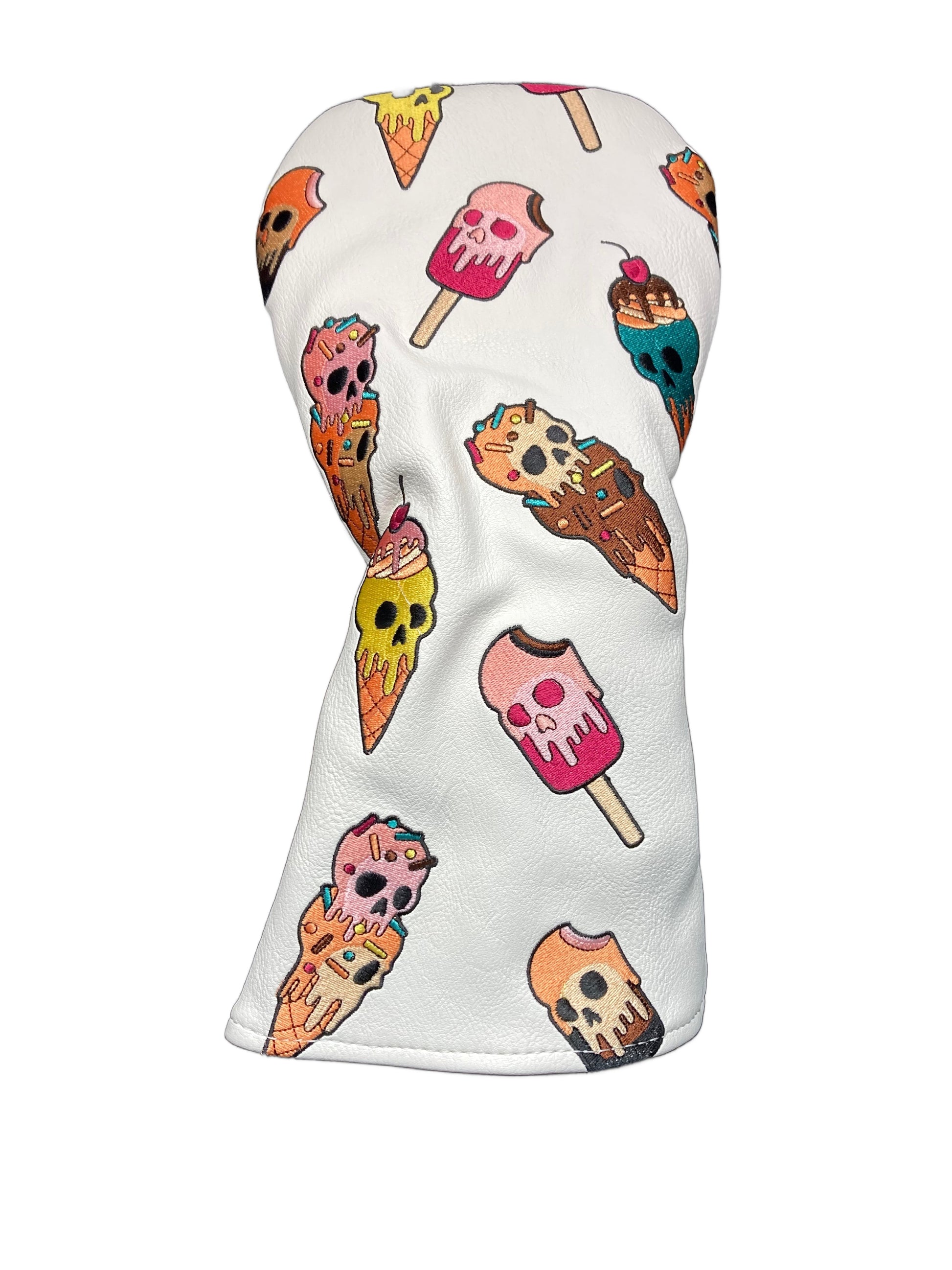 An Ice Cream Skulls Headcover is a fun and unique golf club accessory that combines the playful design of ice cream with a spooky twist of skull imagery. This headcover typically features a skull-shaped design, often with bright, eye-catching colors resembling an ice cream cone or scoop. The skulls may be adorned with details like sprinkles, melted drips, or toppings commonly found on ice cream sundaes.