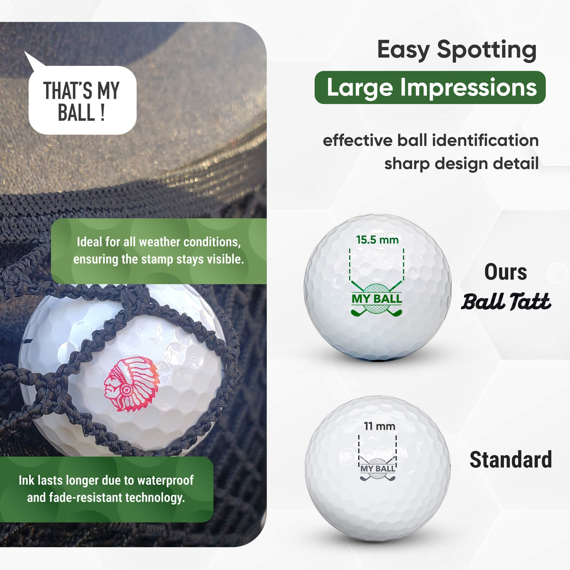 - BIGGER, WIDER, EASIER TO SPOT: Up to 50% larger & easier to recognize than most golf ball stamps! 0.75” x 0.5” golf ball stamper pad imprints BIG permanent impressions for fast & easy ball identification.