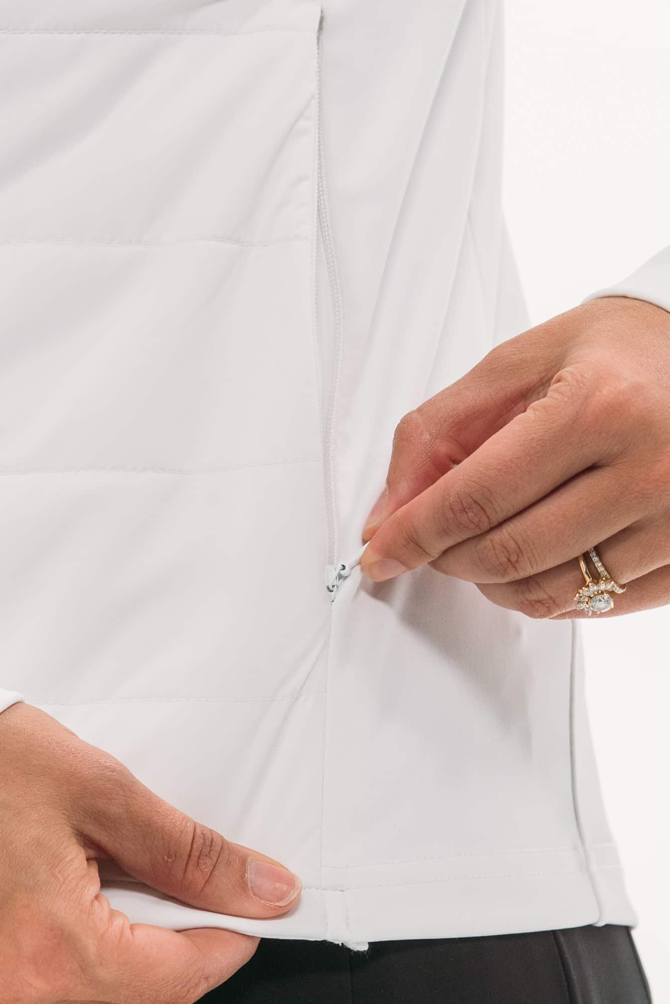 The perfect mashup of your favorite zip-up and quilted vest. This mid to outer layer is soft, stretchy and ultra-durable. Made from a mid-weight technical stretch jersey layered with a quilted nylon front. Dual front zipper pockets for storage and 2-way zip that allows for additional flexibility in fit. Gusseted underarms give freedom of motion while providing a tailored silhouette.