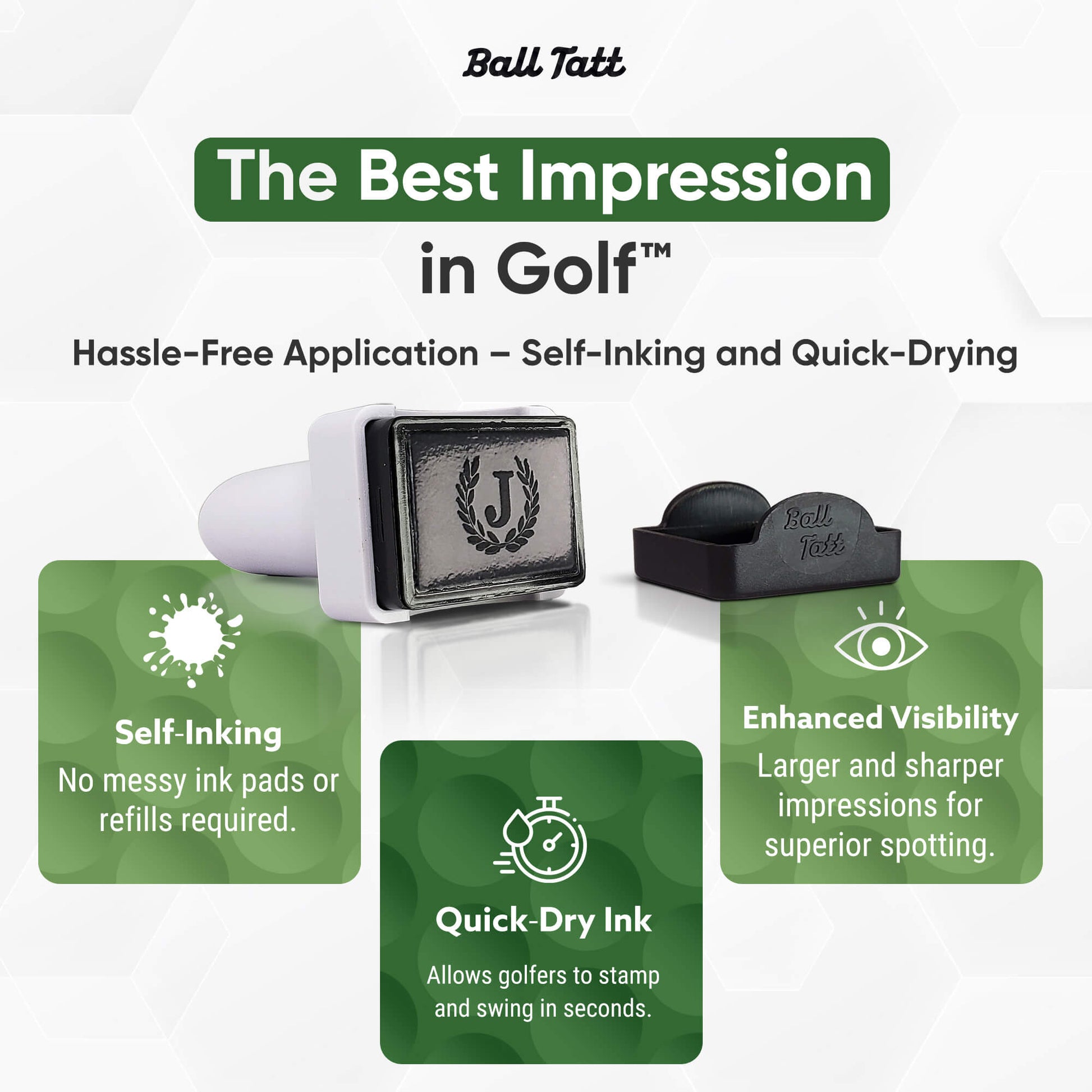 Make your mark with the Ball Tatt Monogram Golf Ball Stamper, featuring a striking "J" framed by a classic wreath. Crafted from durable die-struck metal with a textured enamel coating, this bold sized (33mm x 27.6mm x 2mm) debossed design combines lasting quality with style. Designed to fit magnetic hat clips and pairs perfectly with your ball stamper for a cohesive look. Personalize your game and showcase your unique identity with this essential golf accessory.