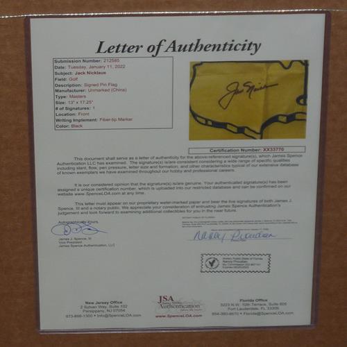 Elevate your golf collection with the Jack Nicklaus Autographed Masters Golf Pin Flag Deluxe Framed with Nameplate and Ball Markers authenticated by JSA. This truly special piece, personally autographed by the legendary Jack Nicklaus, exudes greatness and captures the essence of the Masters tournament. Display it proudly and be inspired by the passion and dedication of one of the greatest golfers of all time. Each signature is witnessed by a member of our staff or comes out of a private signing.