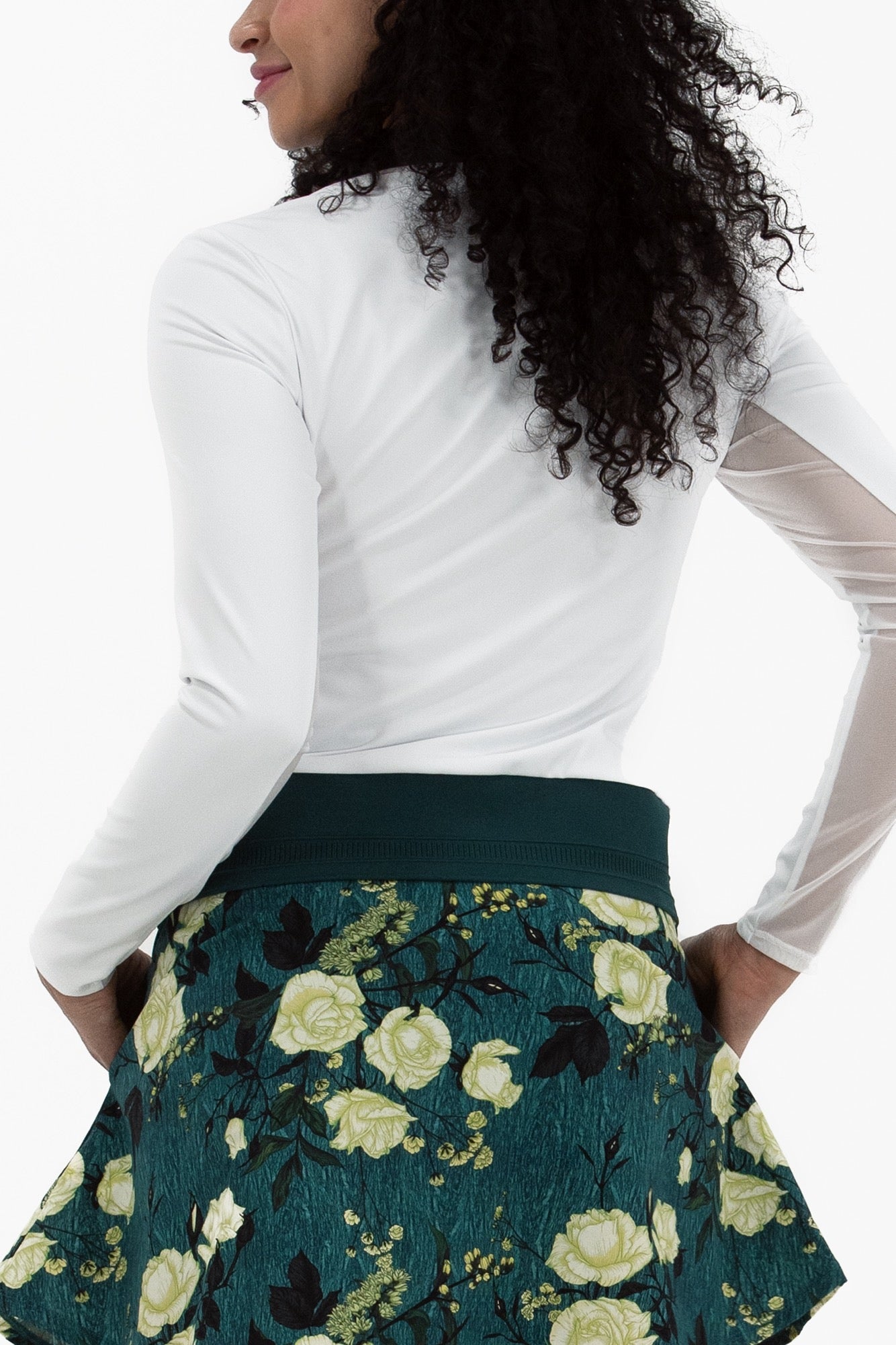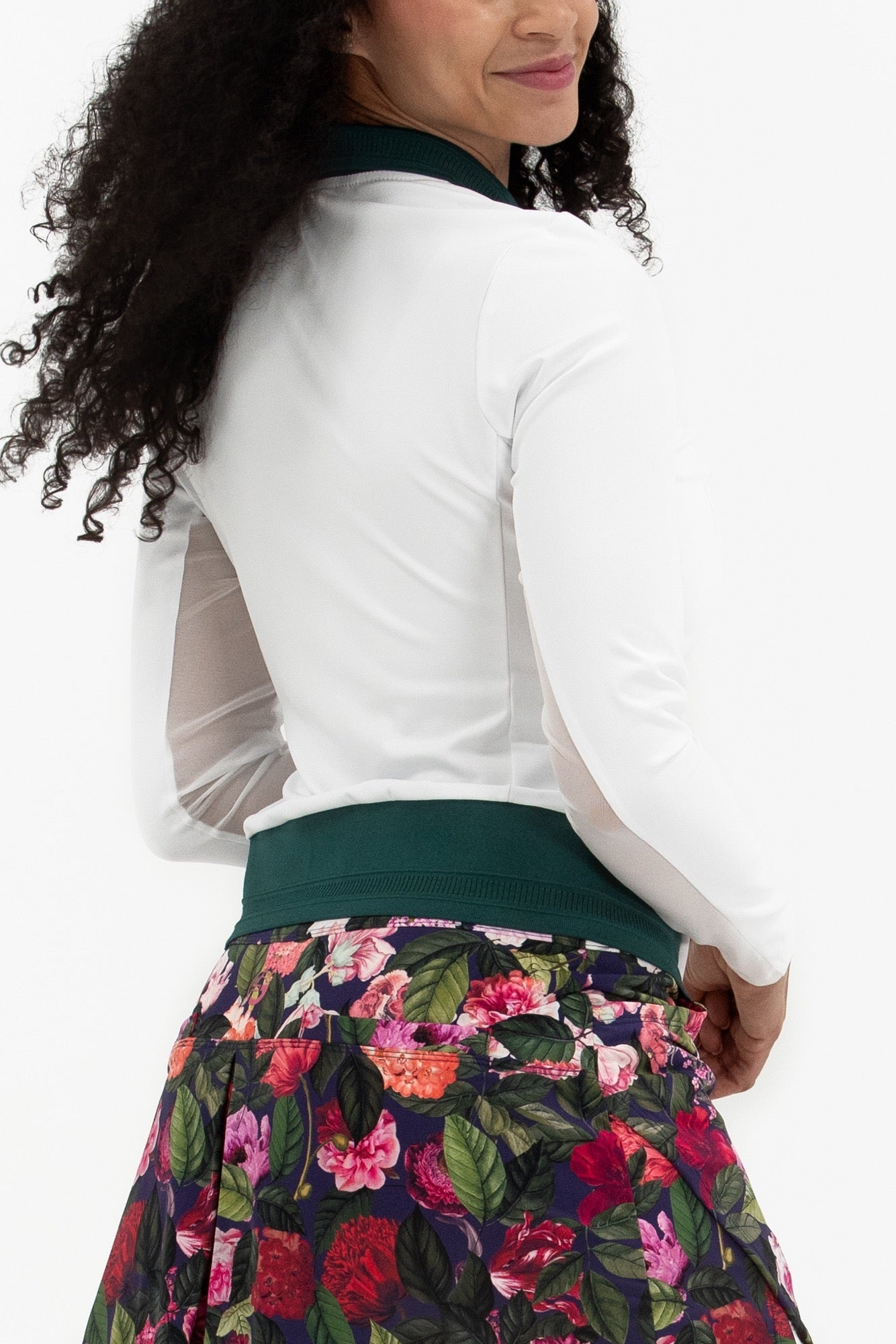 - Mesh under arm panels to add breathability and cooling