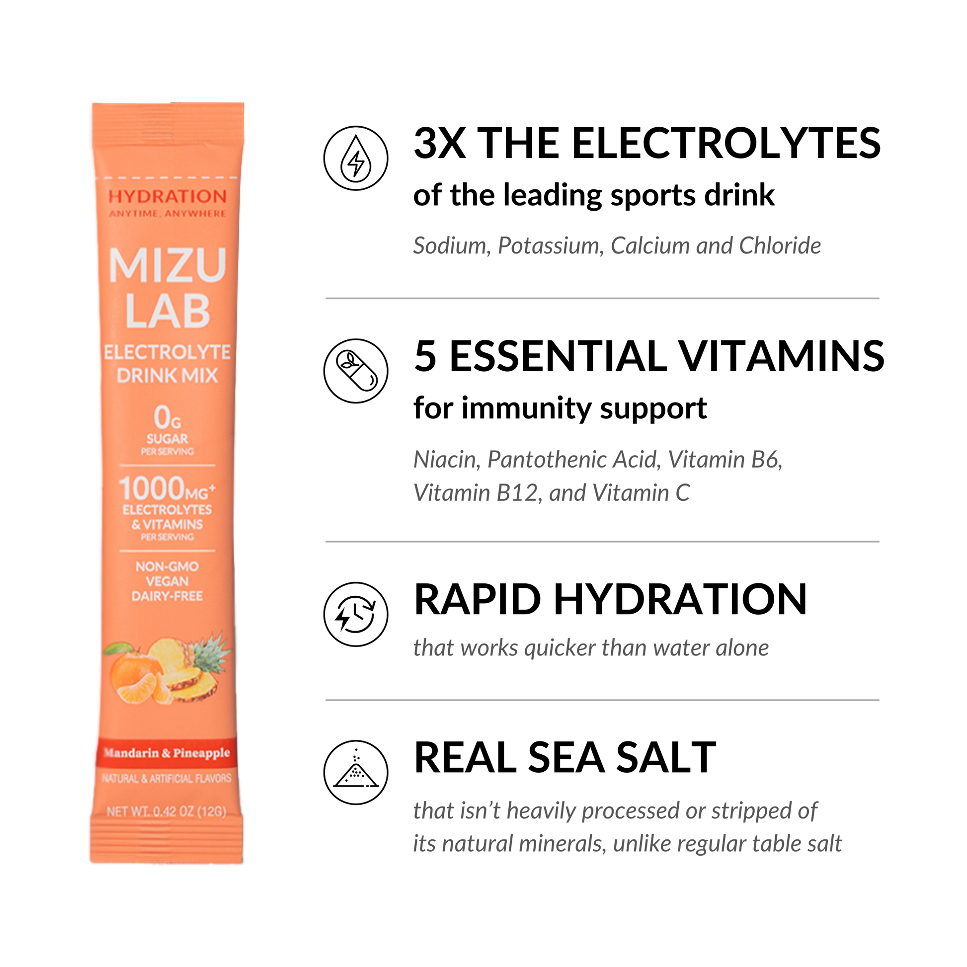 Savor the crisp burst of mandarin orange and the tropical sweetness of pineapple — a sun-soaked combo that tastes like vacation in a stick. Each pouch includes 15 sticks, each packed with over 1,000mg of electrolytes and essential vitamins — all without the sugar.
