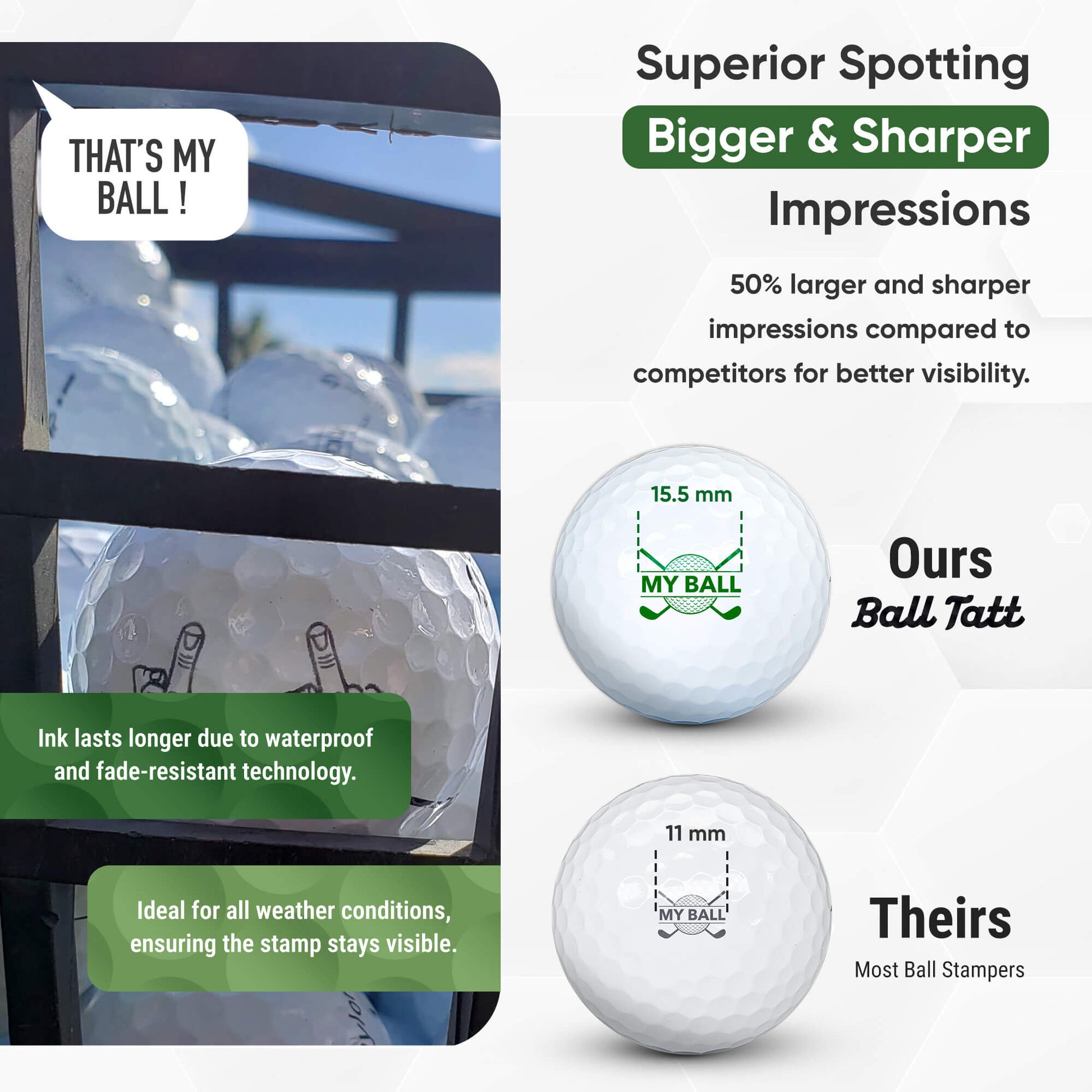 - BIGGER, WIDER, EASIER TO SPOT: Up to 50% larger & easier to recognize than most golf ball stamps! 0.75” x 0.5” golf ball stamper pad imprints BIG permanent impressions for fast & easy ball identification.