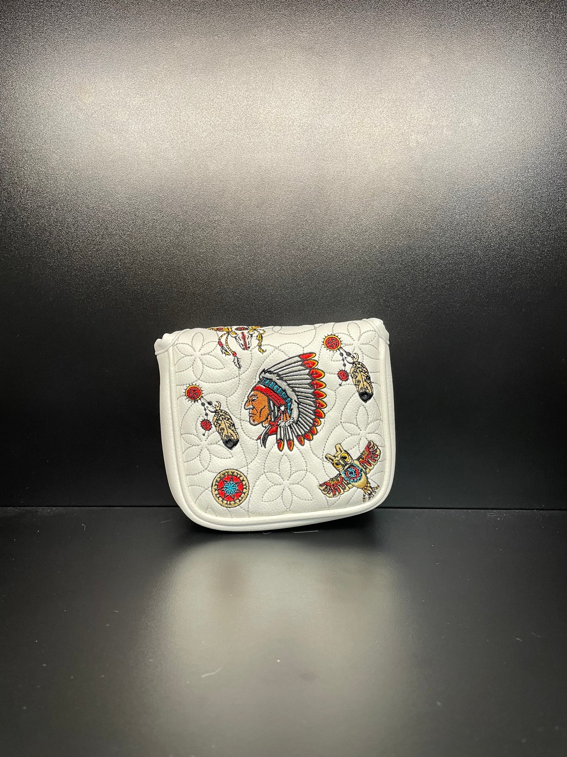The Native American Headcover is a golf accessory designed to protect and stylize the head of a golf club, typically a driver or fairway wood. Inspired by Native American culture and heritage, this headcover often features traditional motifs, patterns, or symbols associated with Indigenous peoples of North America. It may incorporate elements such as geometric designs, feathers, dreamcatchers, or tribal emblems, reflecting the rich history and artistry of Native American cultures. The headcover serves both a functional and aesthetic purpose, offering protection for the club head while adding a unique and culturally significant touch to a golfer's equipment.