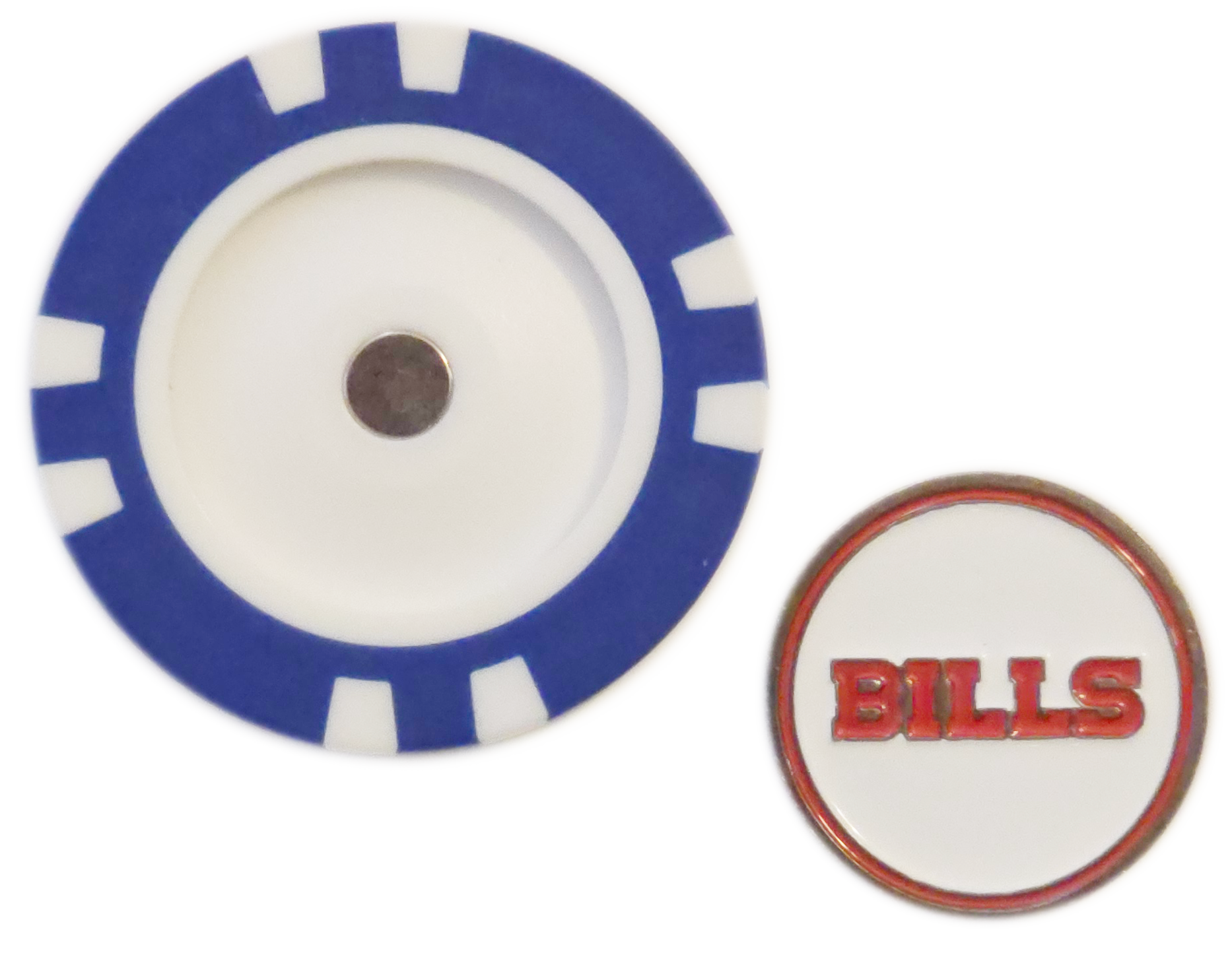 Celebrate the Buffalo Bills with this officially licensed poker chip ball marker. Designed in classic Bills colors and featuring the iconic charging buffalo logo, this marker brings Buffalo pride to every round. The poker chip includes a removable, magnetic metal marker that snaps into place, making it a convenient and stylish way to mark your ball on the course.