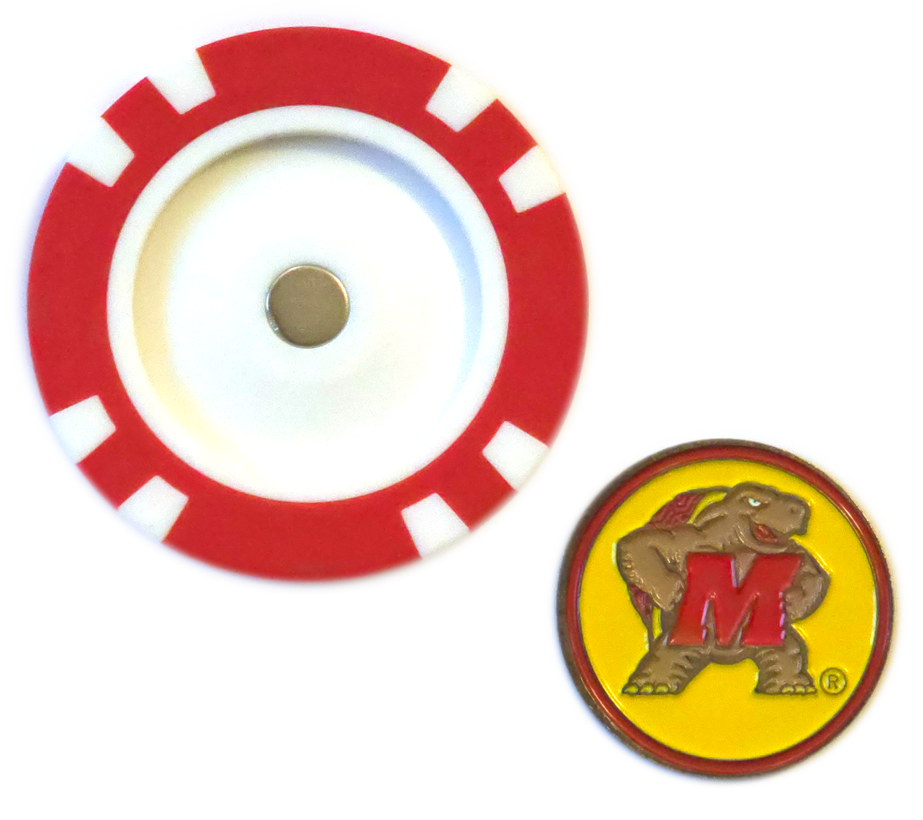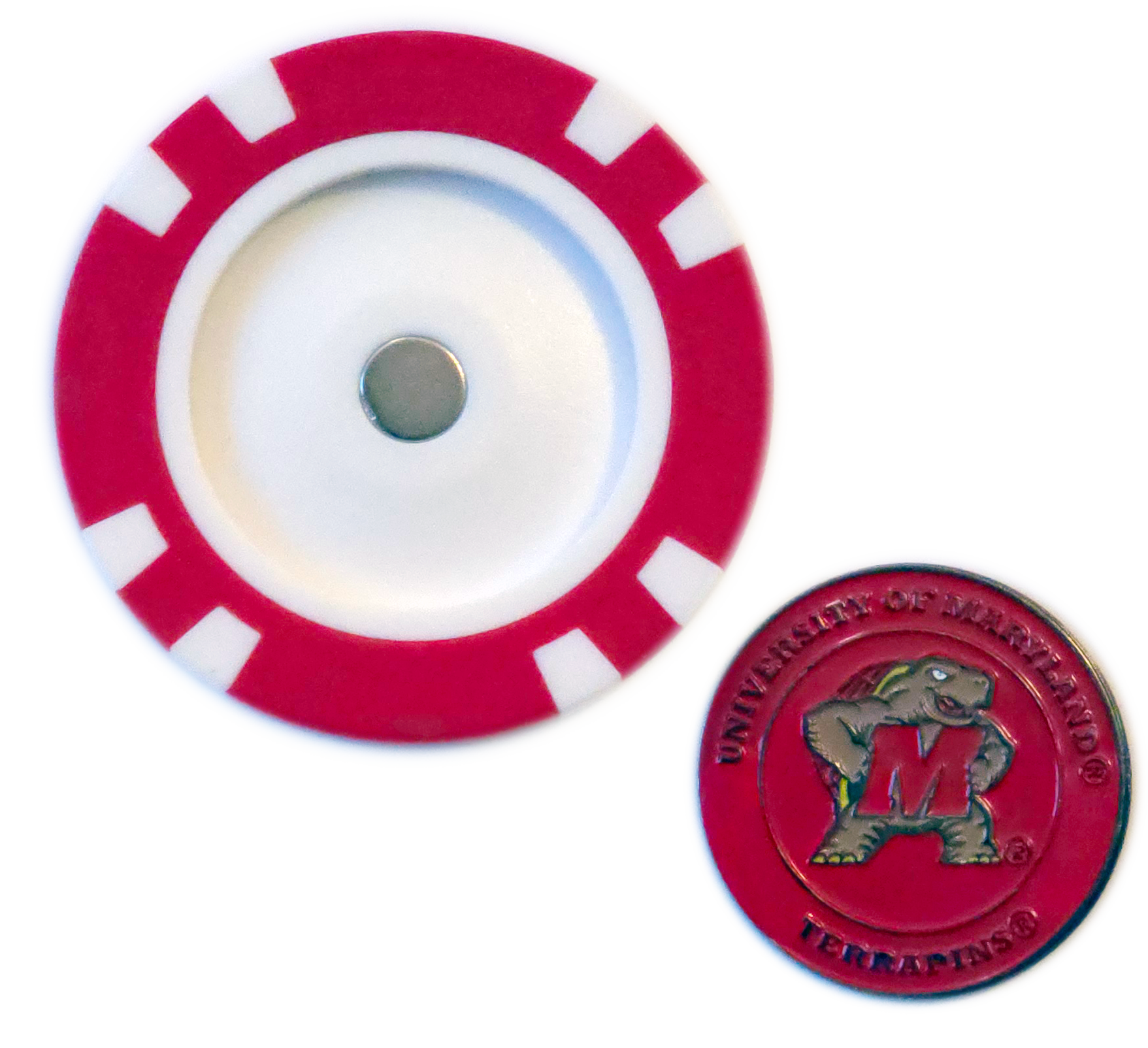 Show your Terps pride on the green with this officially licensed Maryland Terrapins poker chip ball marker! Featuring a magnetic, double-sided metal marker, it’s perfect for fans and alumni looking to rep the red, black, and gold on every putt.