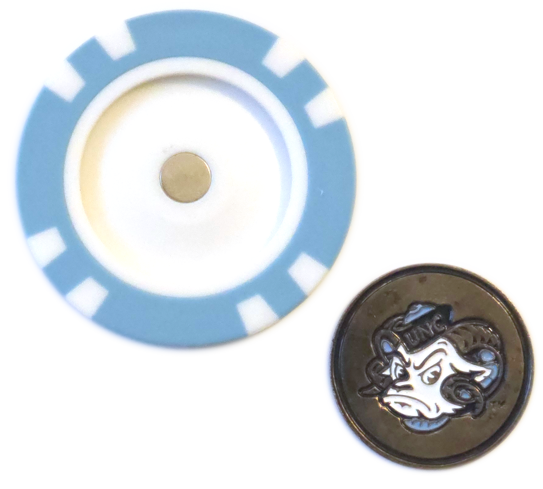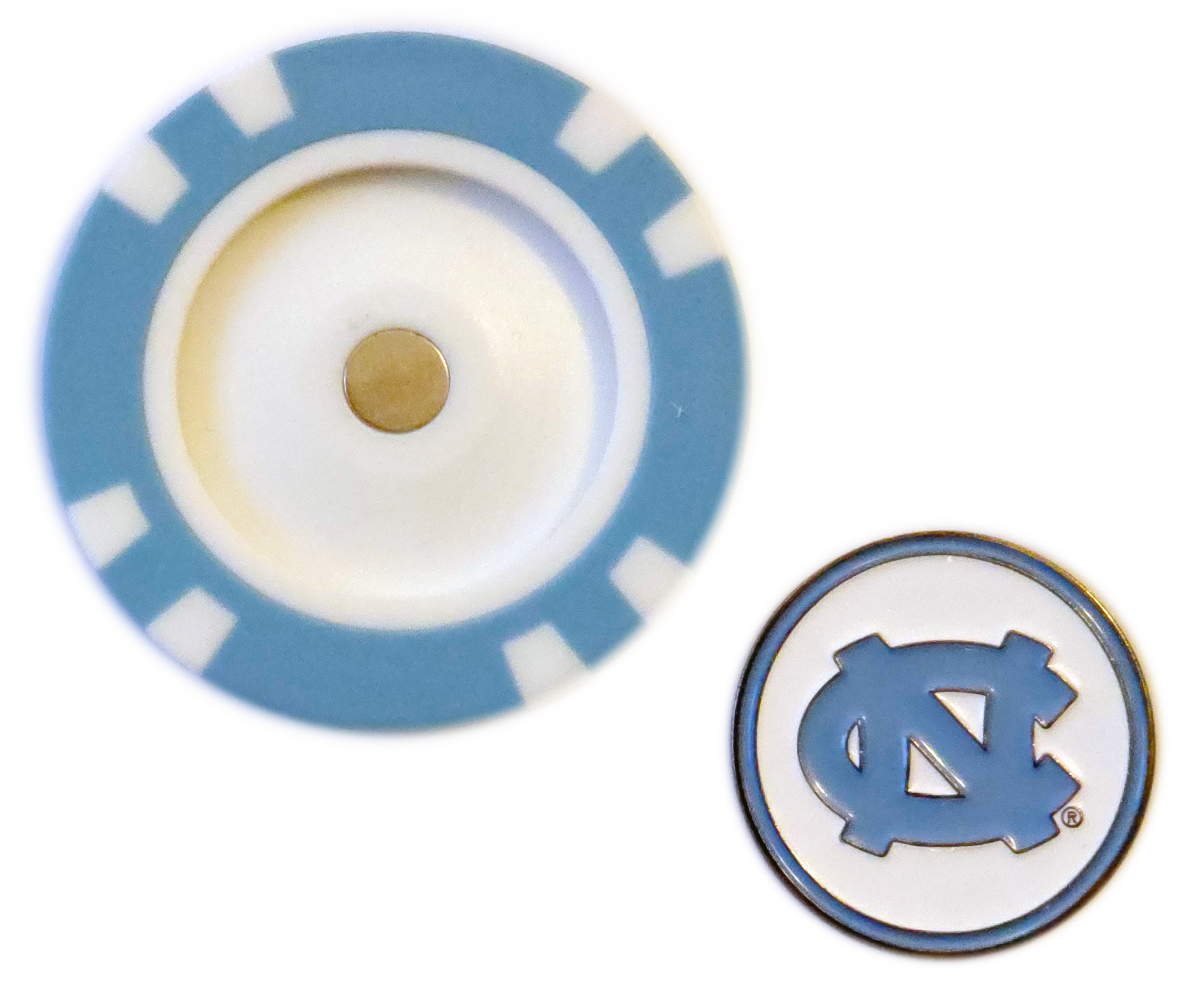 Show your Tar Heel spirit on the green with this officially licensed North Carolina Tar Heels Poker Chip Ball Marker. Featuring Carolina blue and white with the iconic UNC logo, this marker includes a removable, magnetic metal ball marker that snaps into place, combining style and function for every UNC fan’s golf bag.