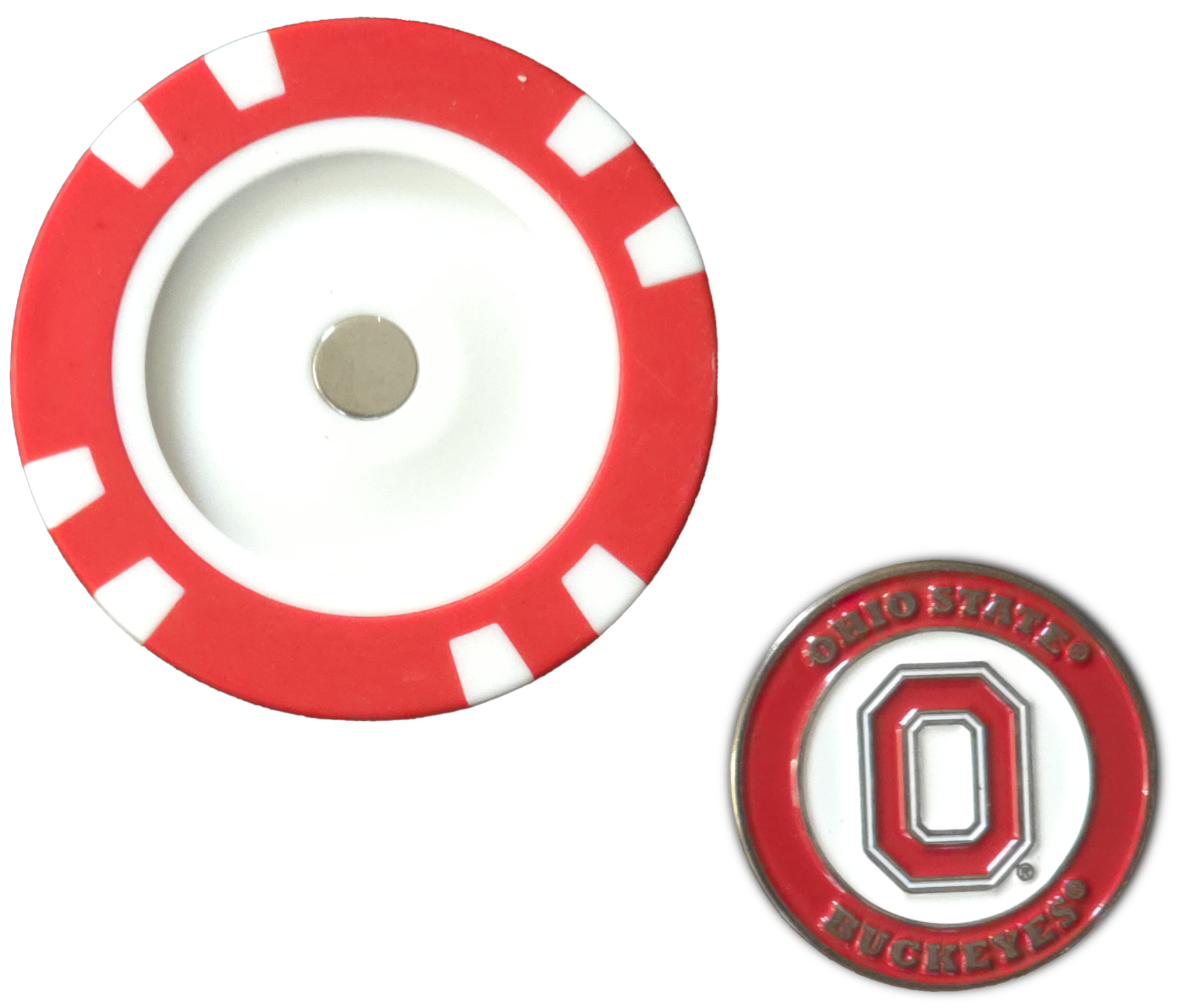Make your Ohio State spirit to the course with this officially licensed Ohio State Buckeyes Poker Chip Ball Marker. Whether you're an alum, a die-hard Buckeyes fan, or just love yelling “O-H!” at every opportunity, this poker chip ball marker is the perfect way to show your pride while marking your ball in style. The poker chip includes a removable, double-sided metal marker that magnetically snaps into place, making it easy to mark your ball while keeping the Buckeyes spirit alive on the green. Featuring Ohio State's iconic logo, this marker is a must-have for any fan who bleeds scarlet and gray.