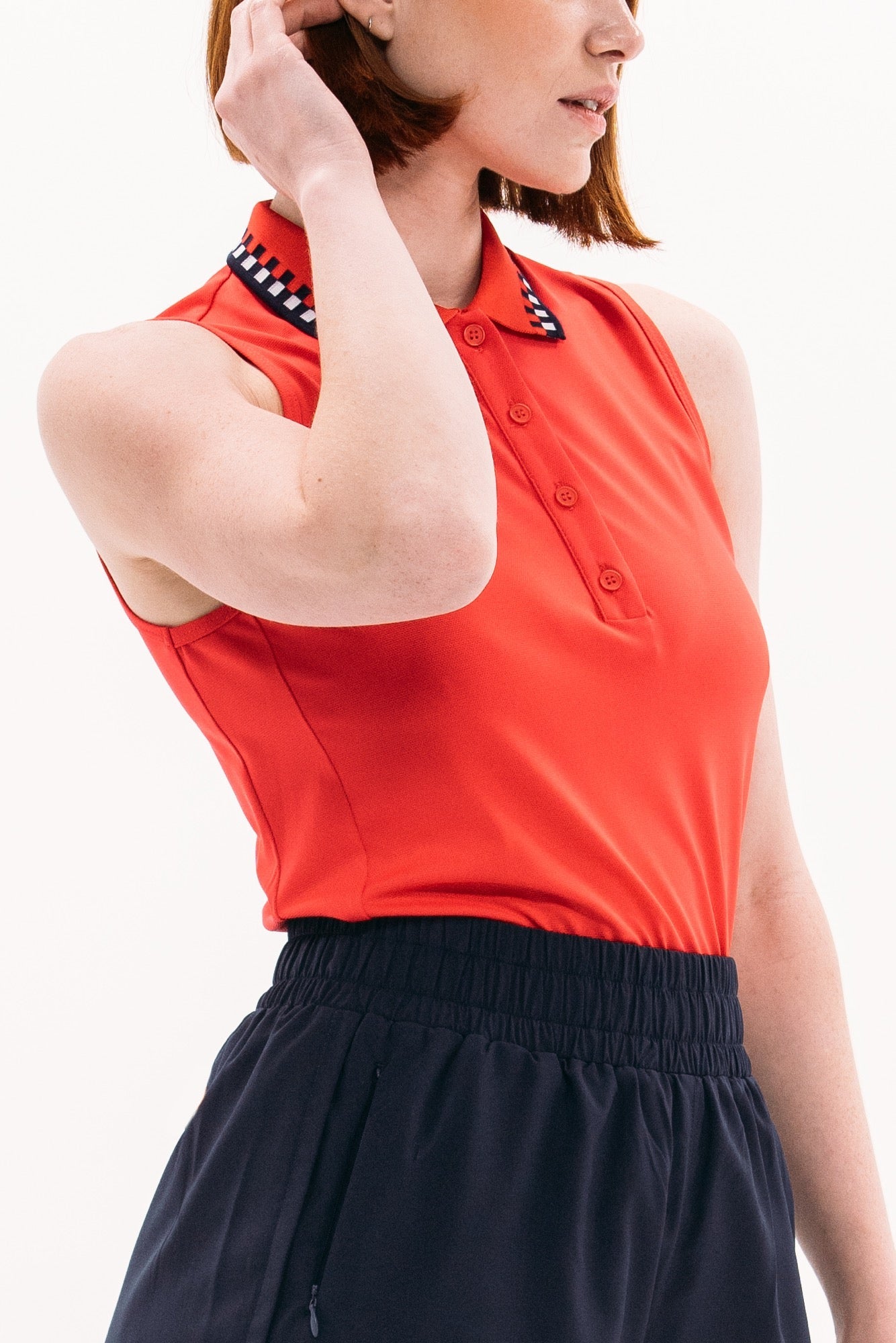 Made from gorgeous "Nantucket-red" technical Italian pique, we're bringing back our most loved sleeveless polo shape. With a classic button front placket and side panel seam construction that flatters all body shapes, she's reinvented to fit today's sport chic guidelines. Topped with a cool, engineered knit collar, this piece is easy to pair back to every navy, white or grey piece already in your rotation.