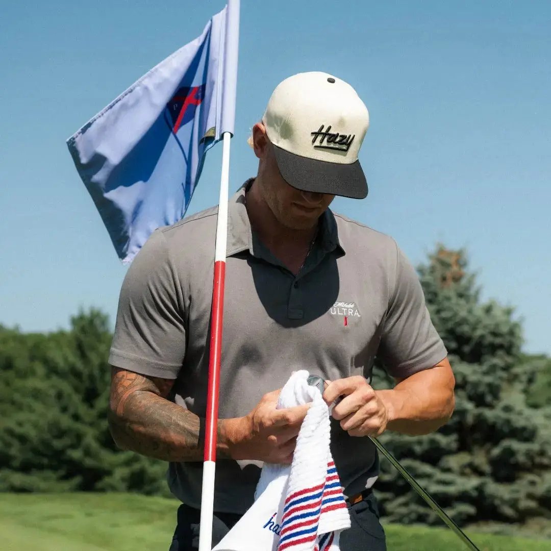 Inside, you’ll find Hazy Golf-branded inner taping and a custom club‑and‑stick tag, time‑ and weather‑tested for durability. One-size-fits-most via adjustable snap closure. A sporty navy crown meets bright white bill for a crisp, versatile look that complements any golf outfit or streetwear vibe.