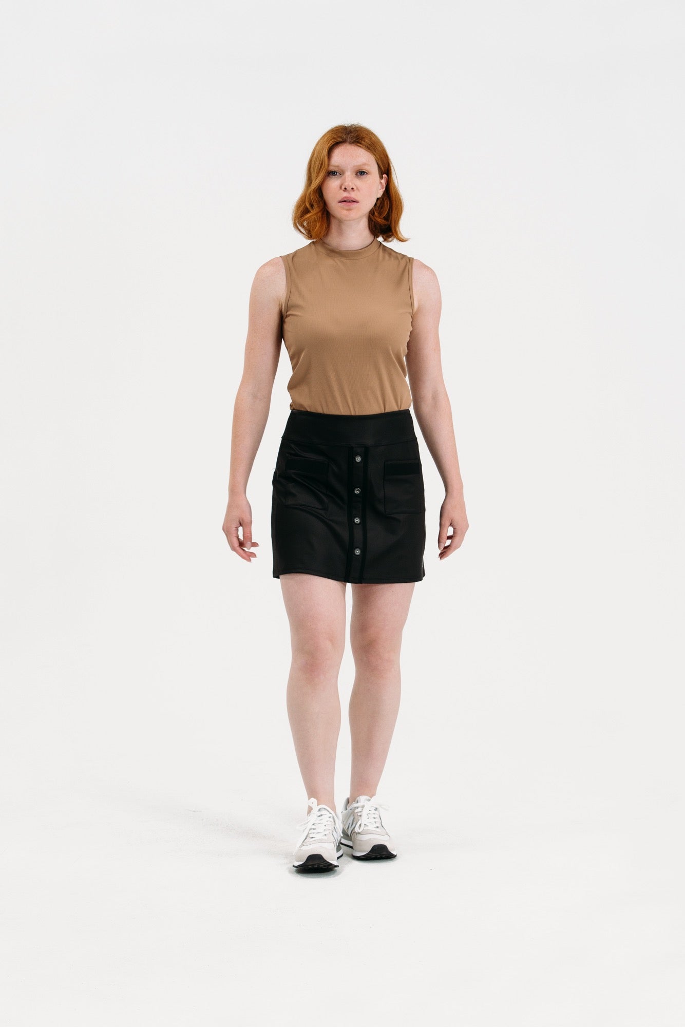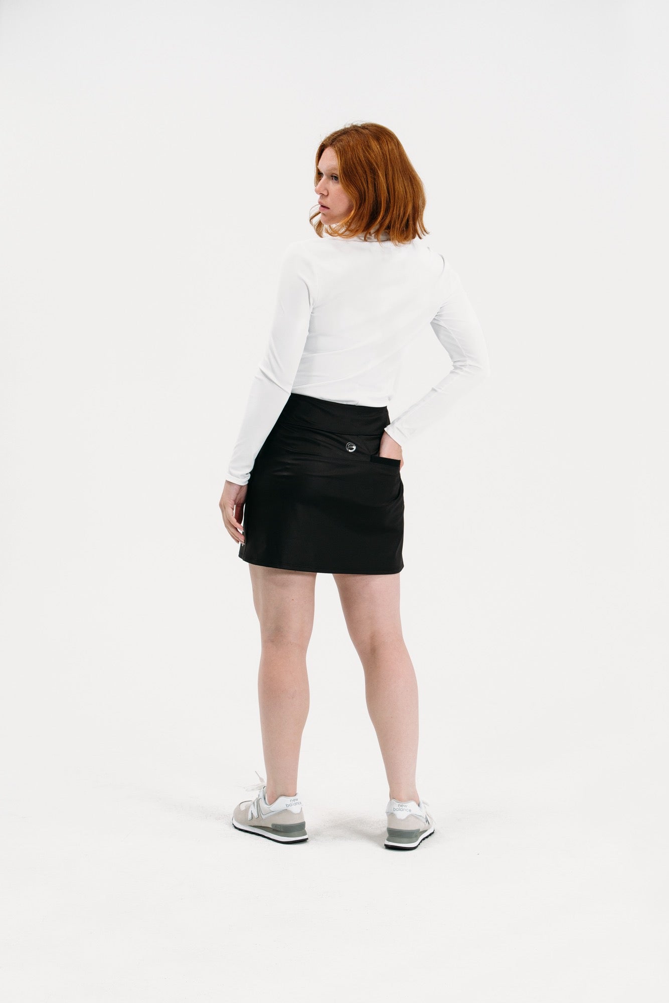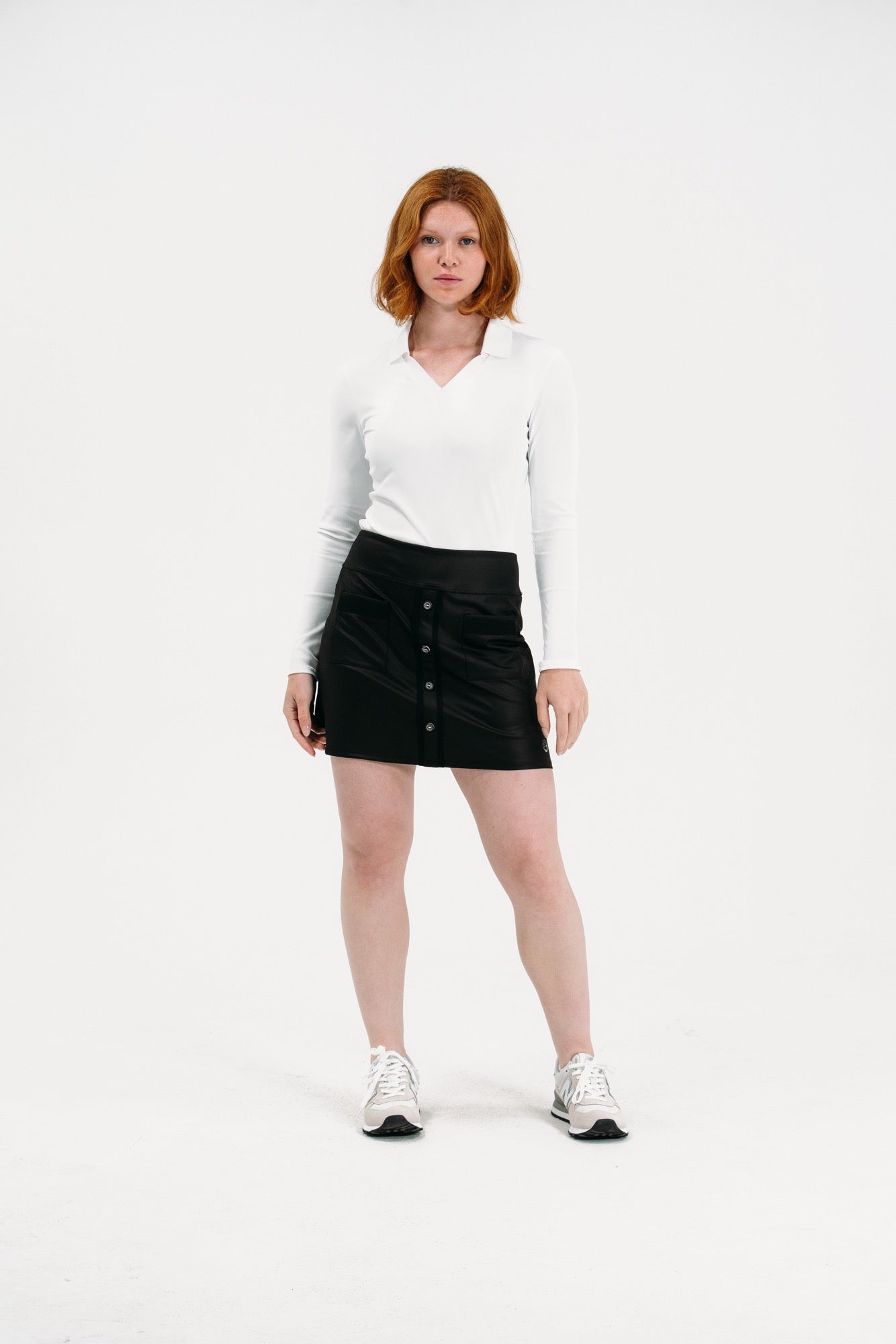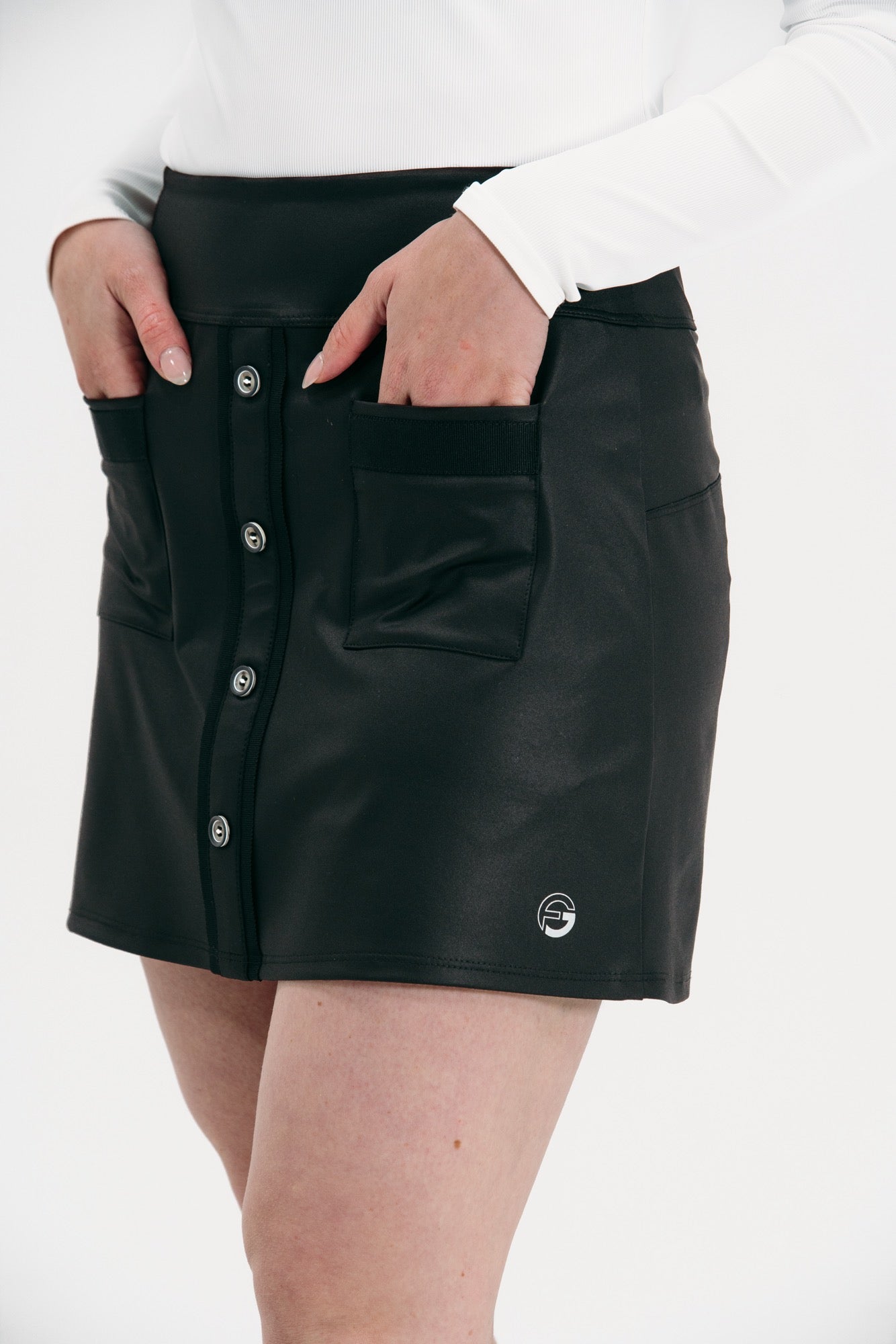 Looks like faux leather, but made from 4-way stretch, wrinkle resistant performance fabric, with gorgeous hand applied grosgrain trim and accented with Italian origin buttons. Features our Sneaky Pocket shorts that hide balls, tees, & phones. Silicone gripper leg openings and channel gusset construction to stay-put.