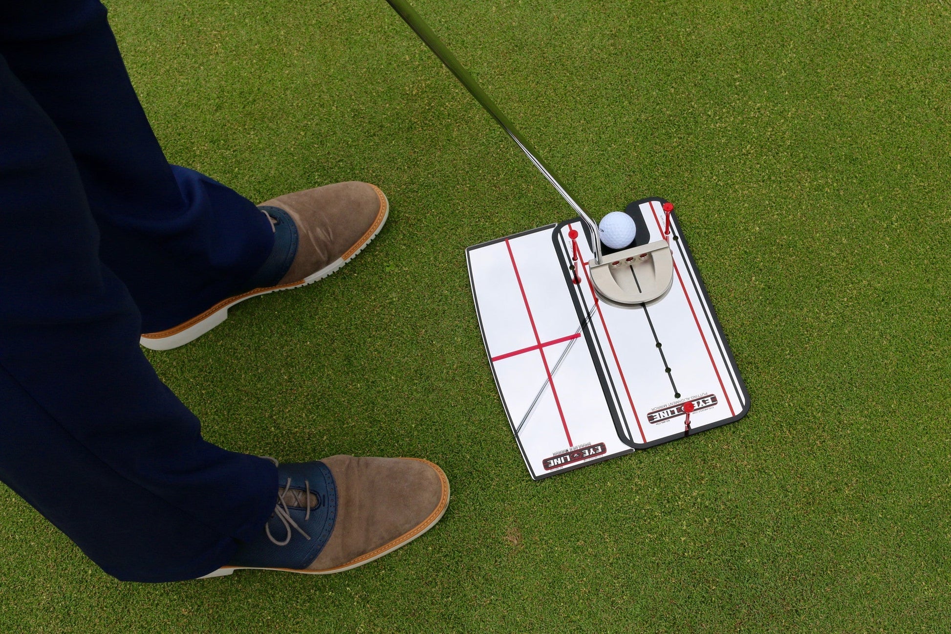 Match your shoulders to the mirror lines and you are ready for more solid, end-over-end rolls. No more cut putts.