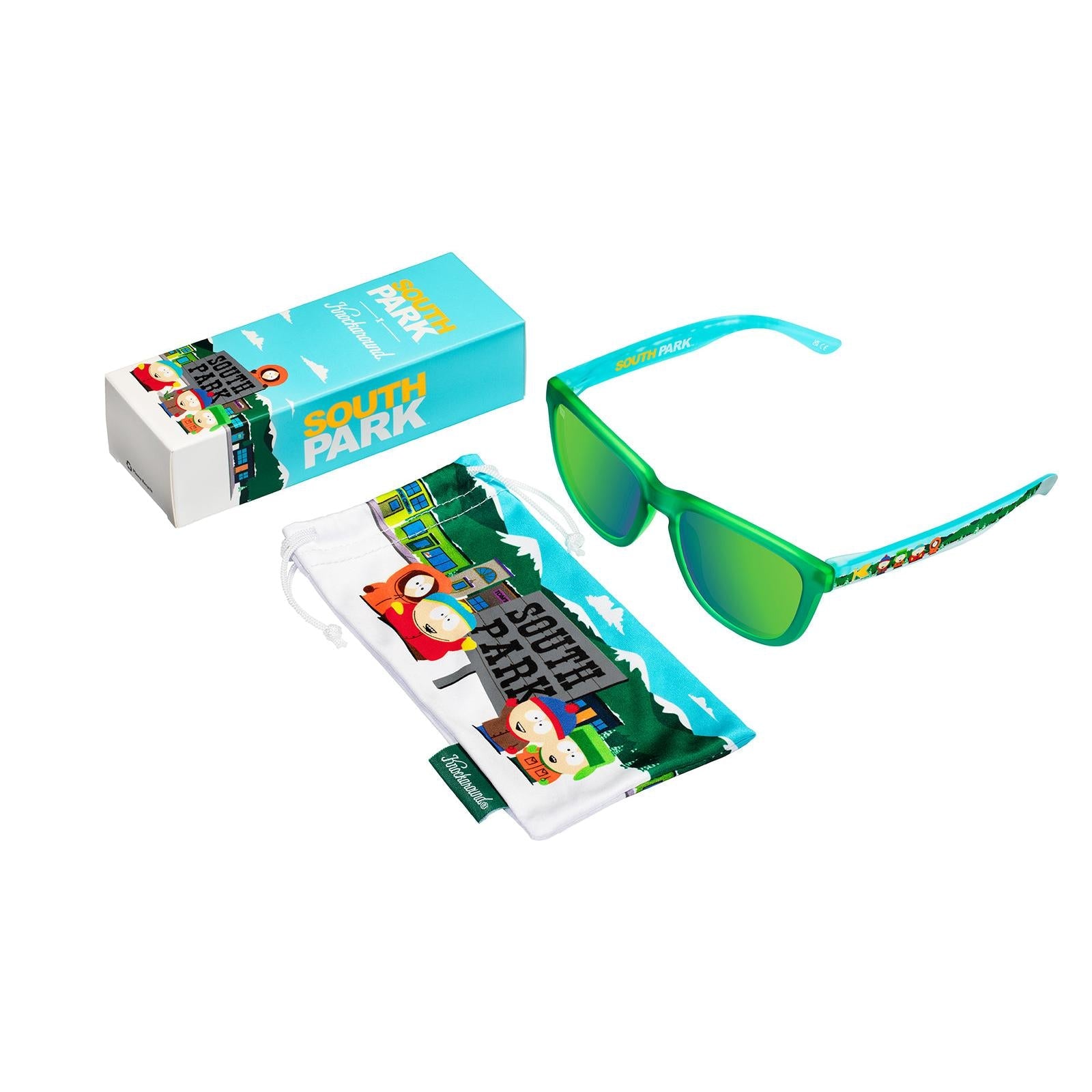 Head down to South Park with the South Park Premiums—designed for just about any face size and built for adventure. These bold green shades feature Stan, Kyle, Cartman, and Kenny on the arms, ready for whatever shenanigans come your (or their) way. The polarized green lenses block out glare as you dodge ManBearPig or hang with the boys. With vibrant yellow K logos and a custom South Park microfiber pouch, these sunglasses are the ultimate accessory for any fan. Snag a pair before they’re gone faster than Chef’s chocolate salty balls!