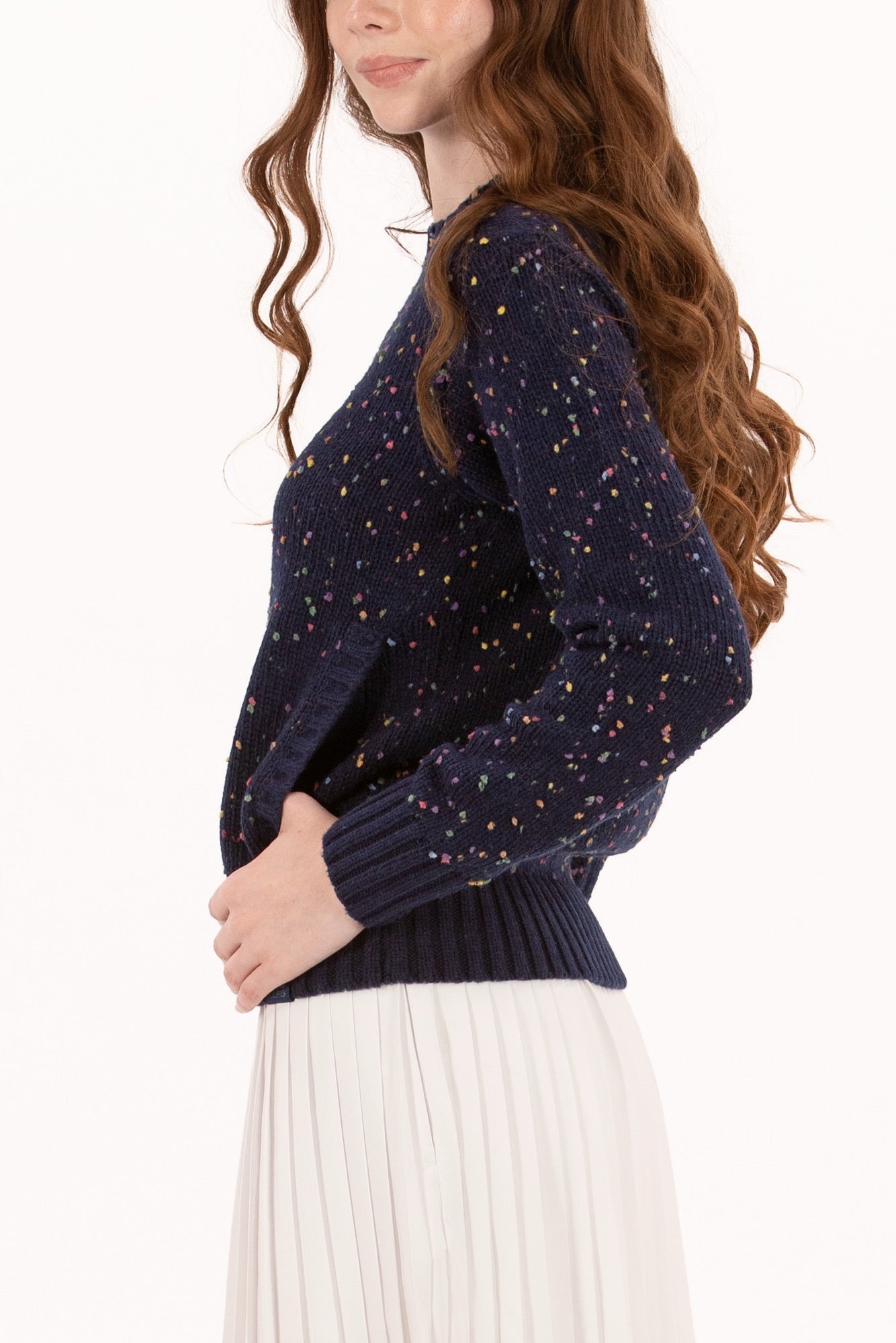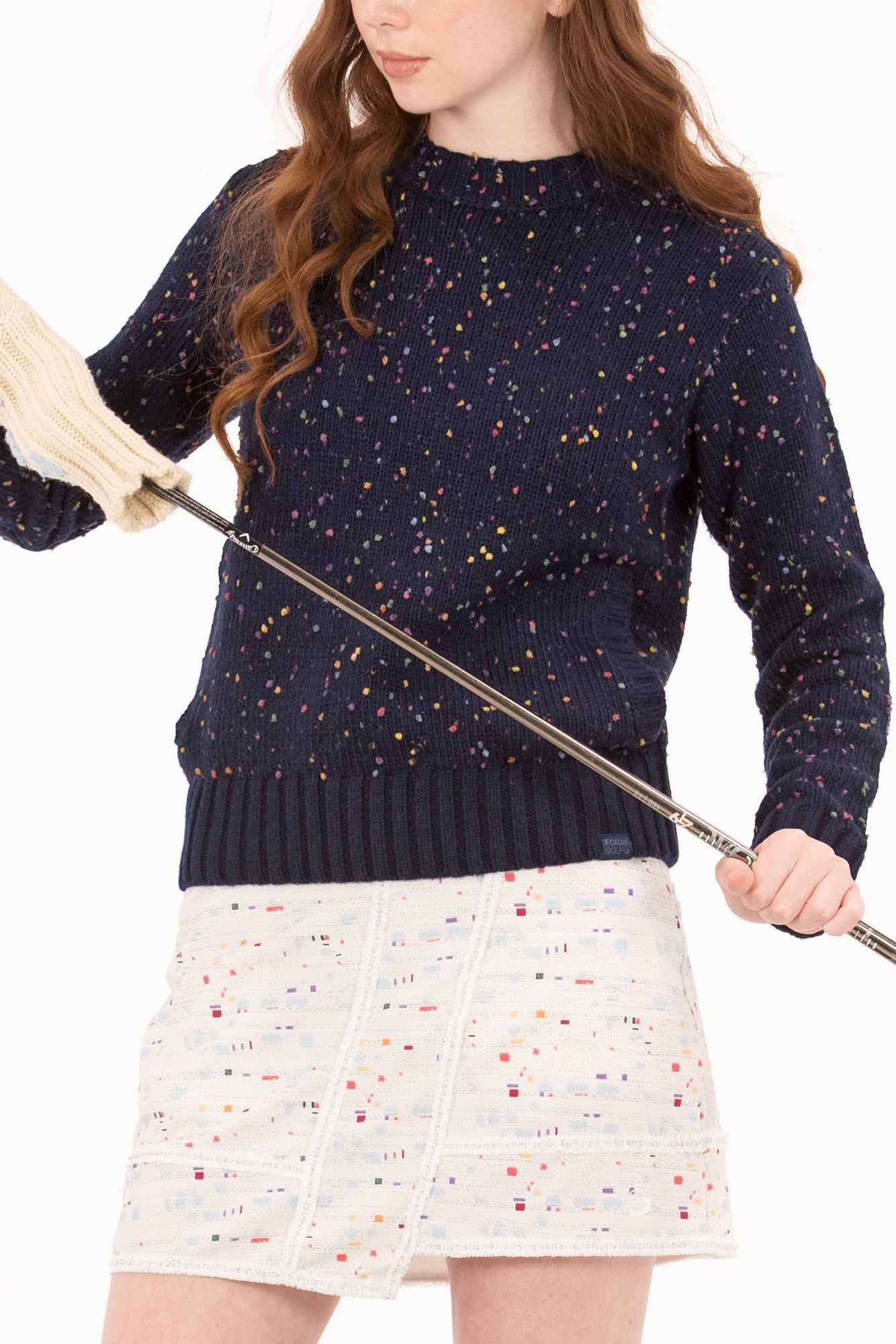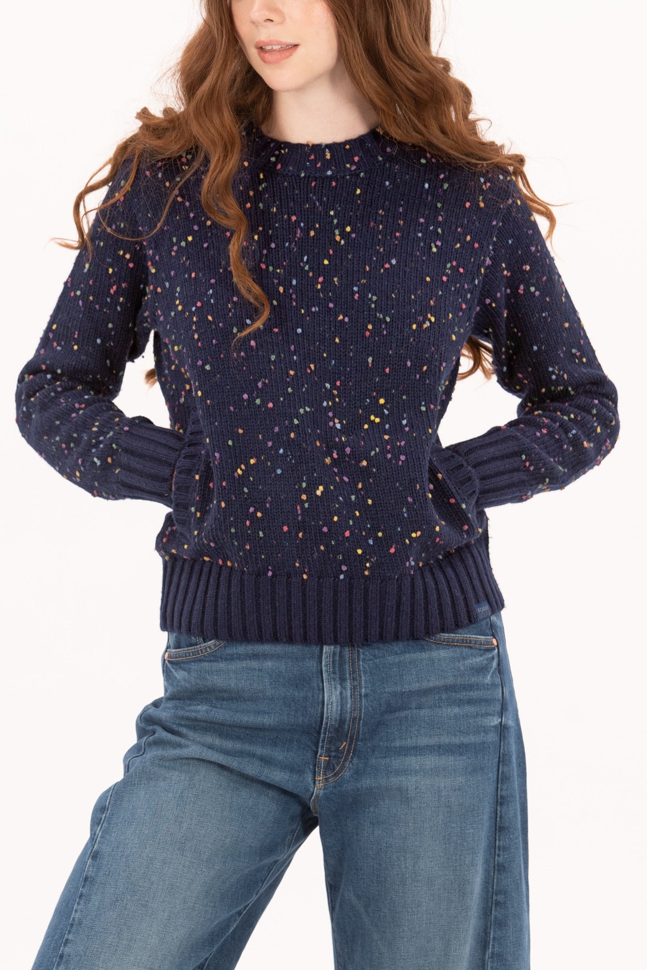 Ribbed crewneck sweater knit from soft technical fibers with a navy base and multicolor flecks throughout. Features front patch pockets, ribbed cuffs, and hem. Easy to match, with a dimensional look and comfortable midweight feel.
