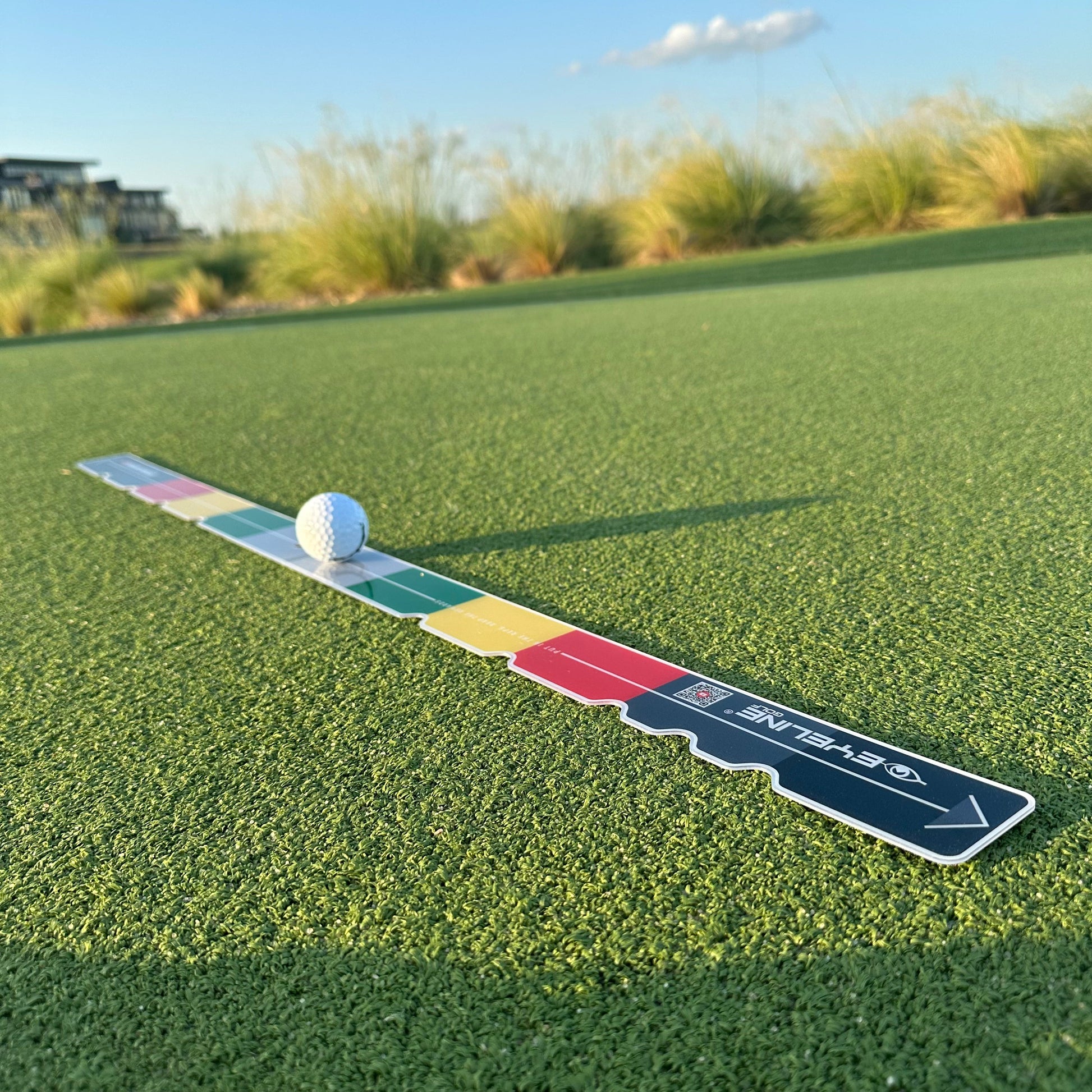 The goal of the Stroke Meter is to help you develop a stroke that is the same length back and through, at a consistent rate of acceleration. The color blocks on the board let you see equal distances back and through. Simply swing the putter to the same color on both sides of the ball, practicing different distance putts.