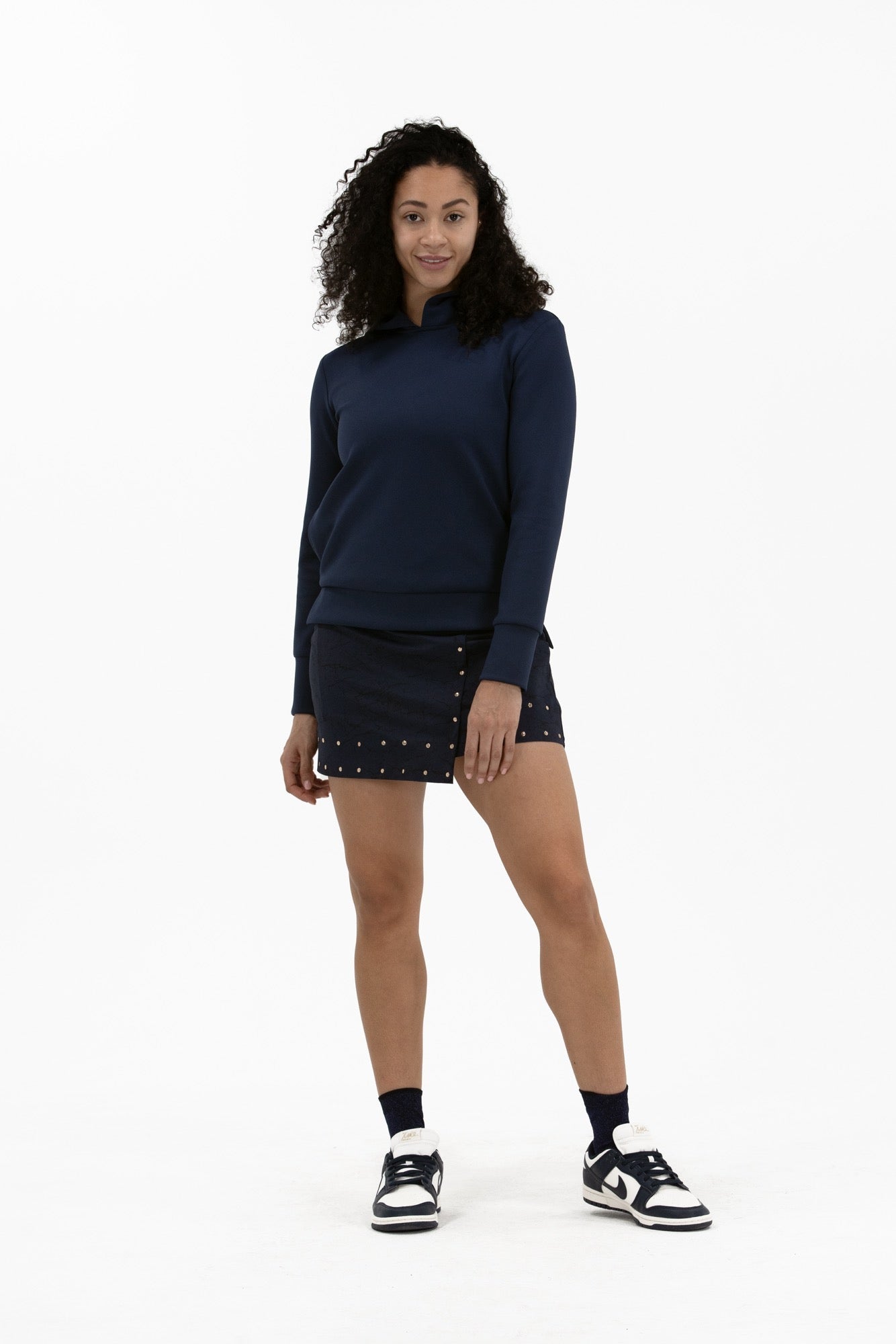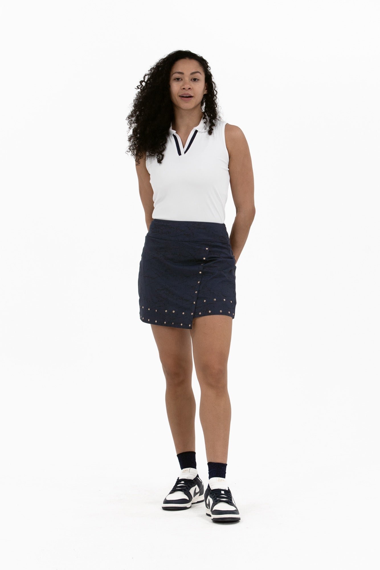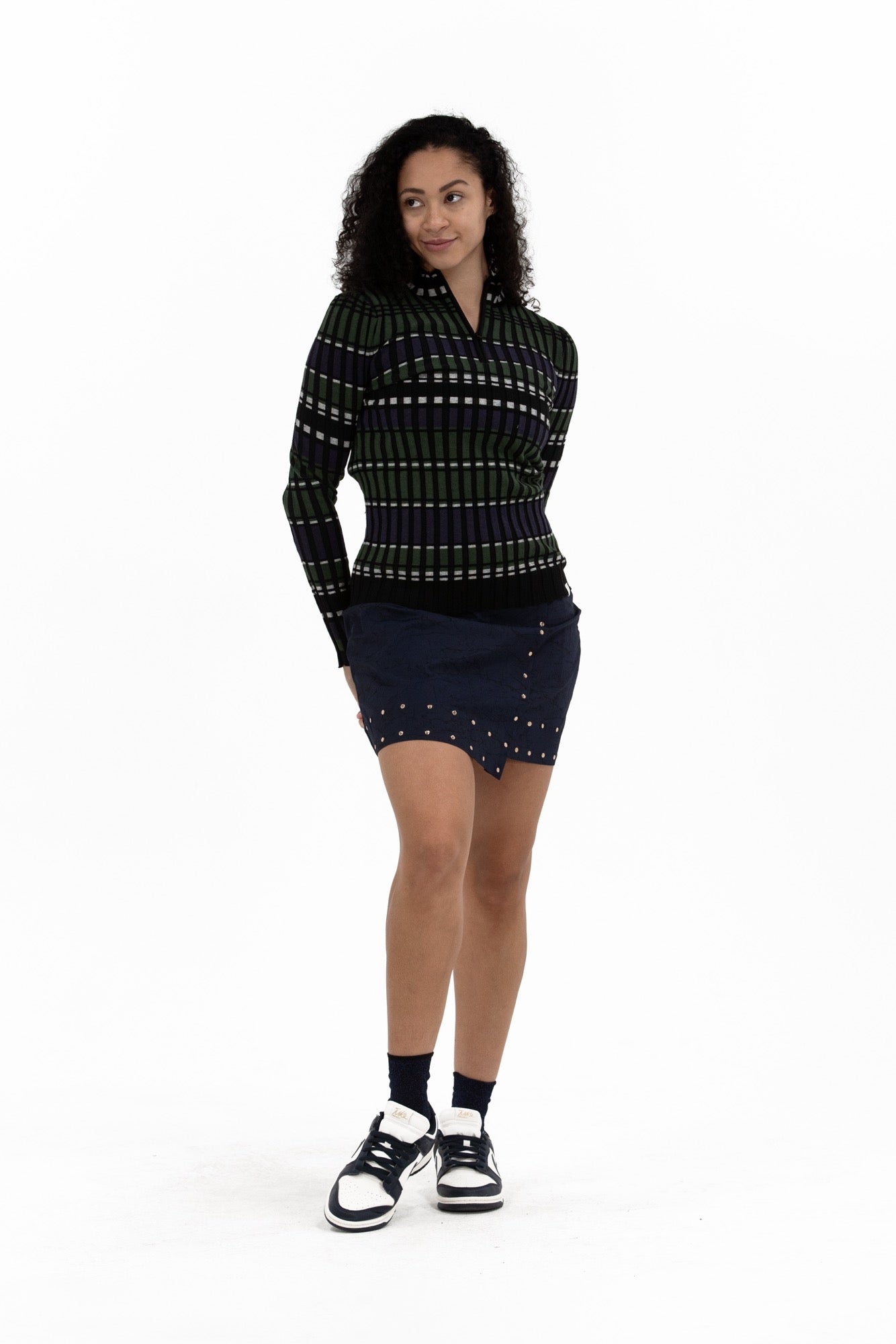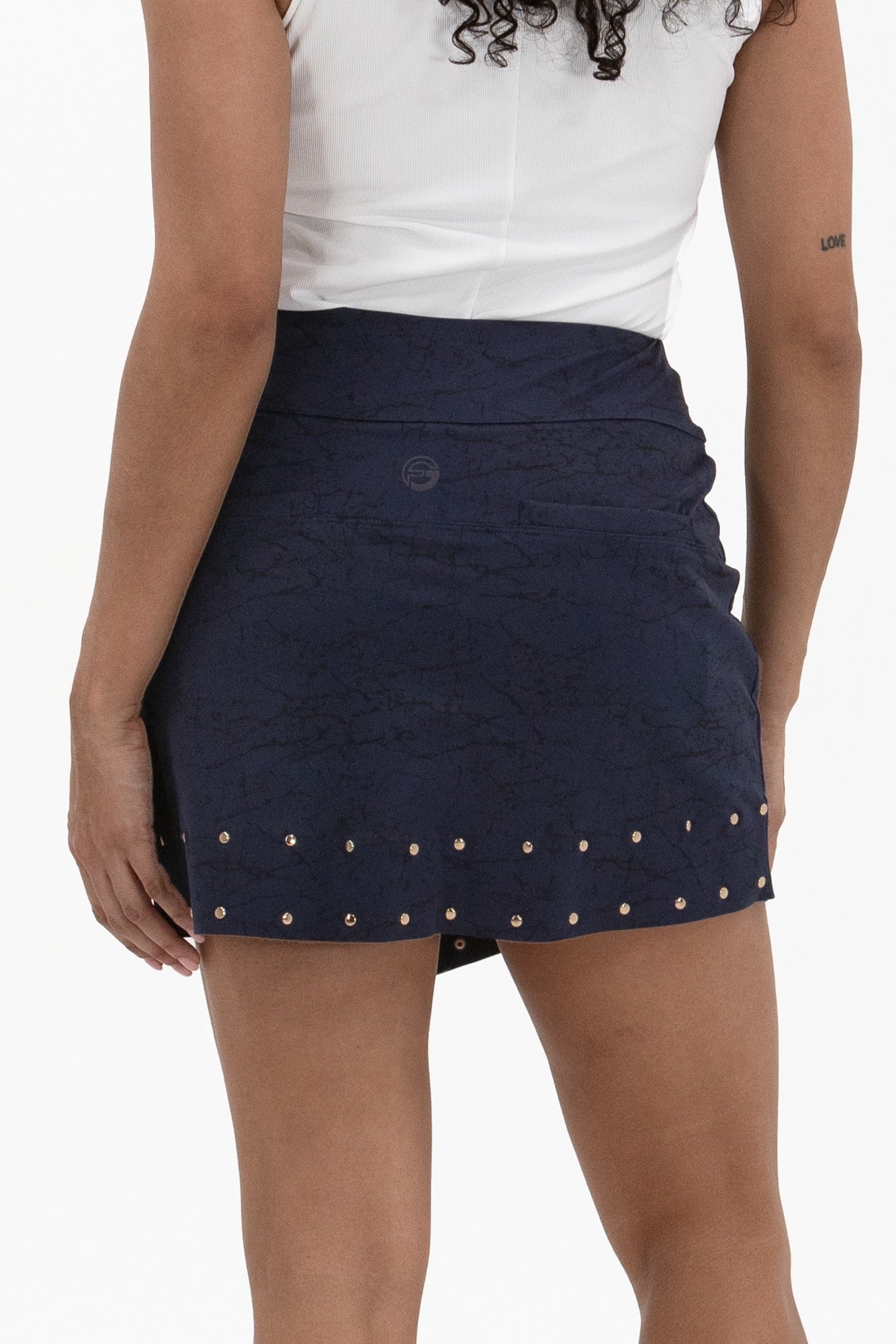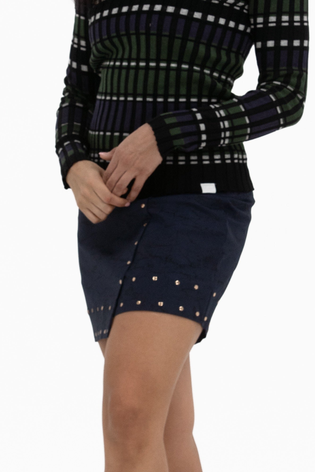 Real Foray loyalists will recognize this reinvention of one of our classics. Remade in our newest A-Line skirt body with an asymmetric, faux wrap-front, in shades of navy crackle print. Features a (real) metal studded front and bottom hem.