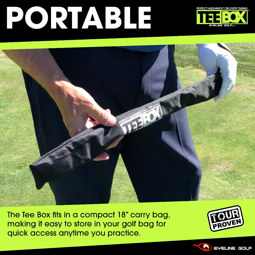 Enter the Tee Box, a big upgrade over average alignment sticks. Quick setup and effortless target changes ensure your lines are always parallel. Portable and practical, it slips right into your bag.