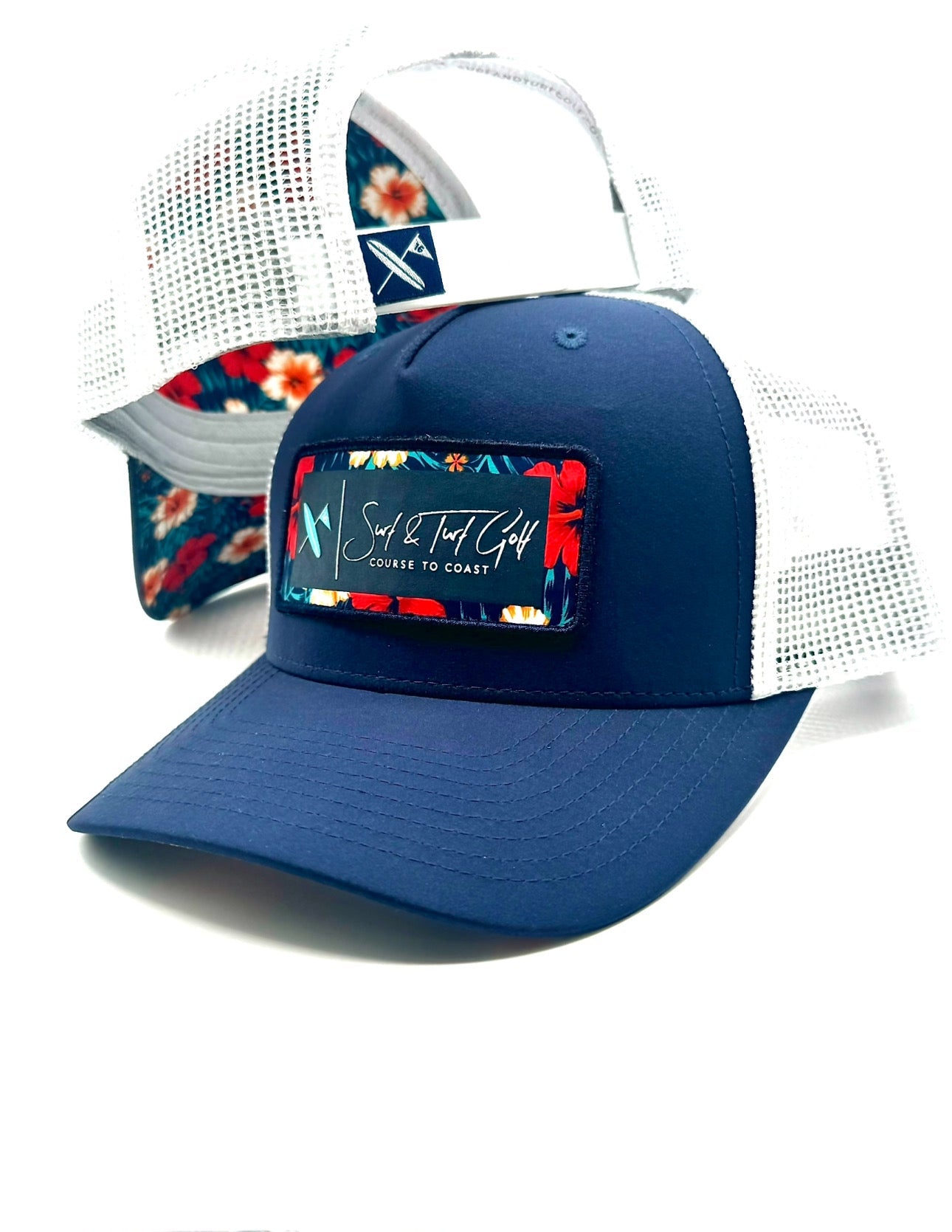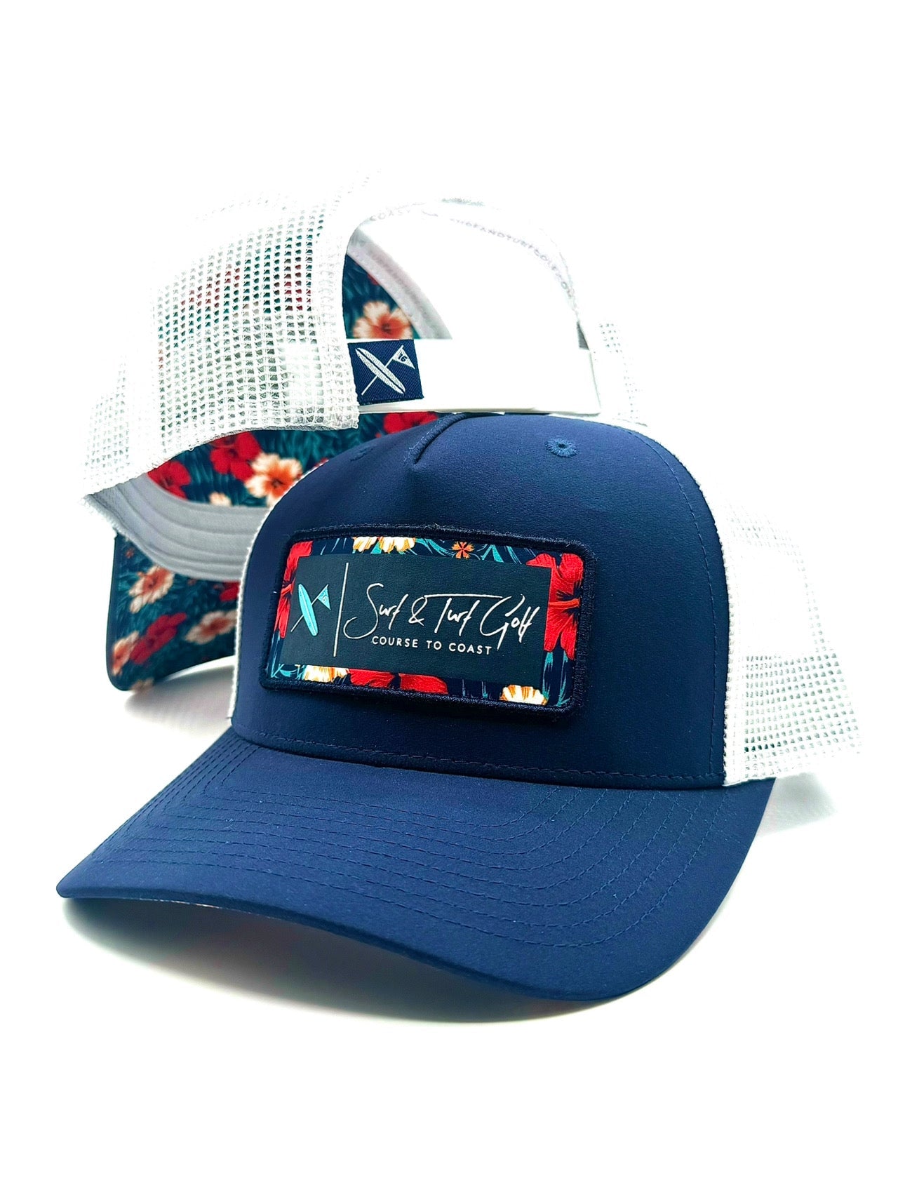 - Navy and White Snapback Trucker with Navy/White and floral S&T Press 020 Rectangle Patch