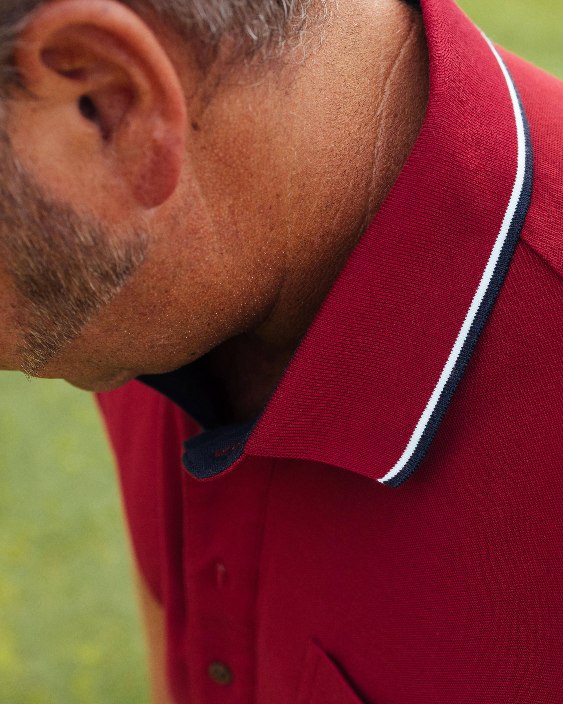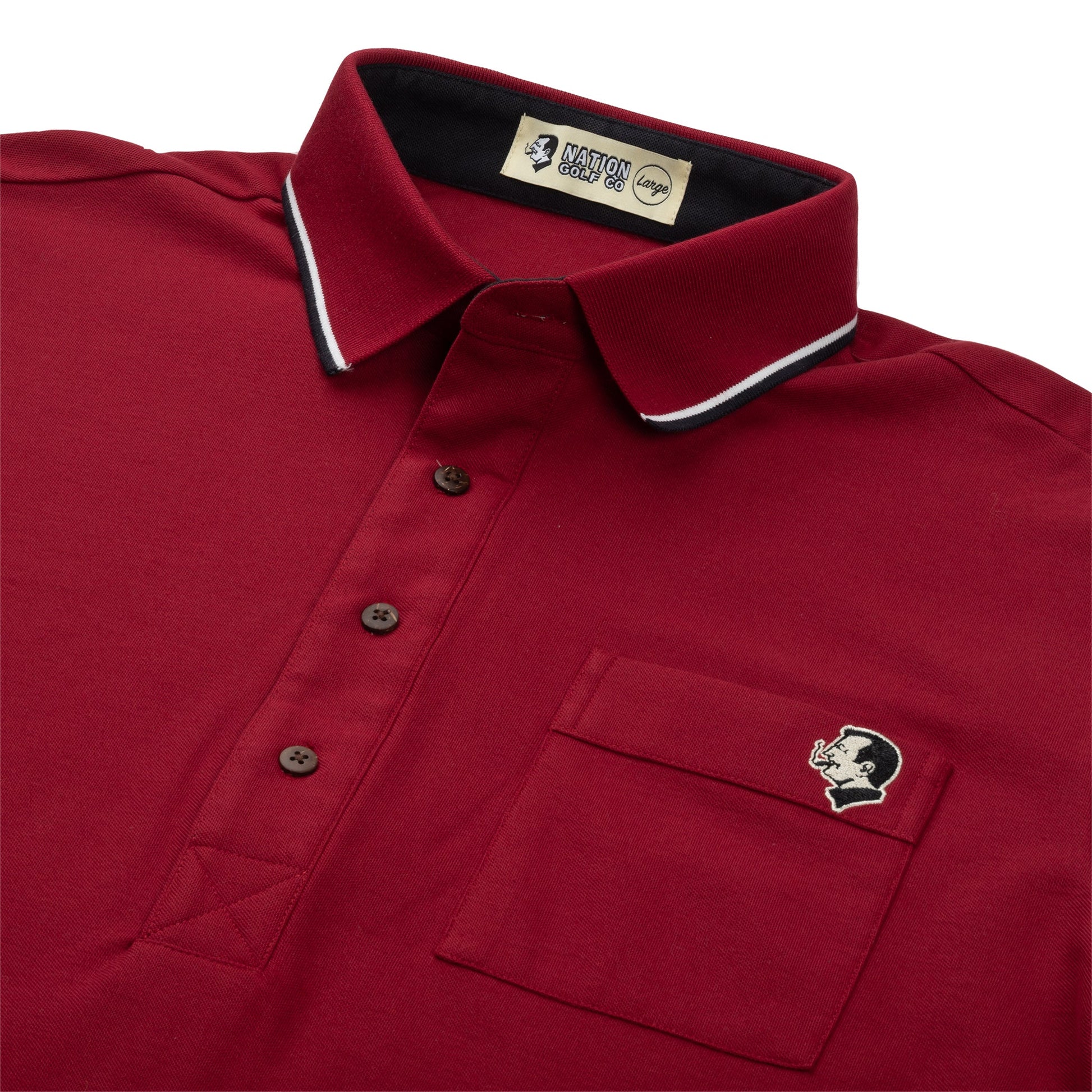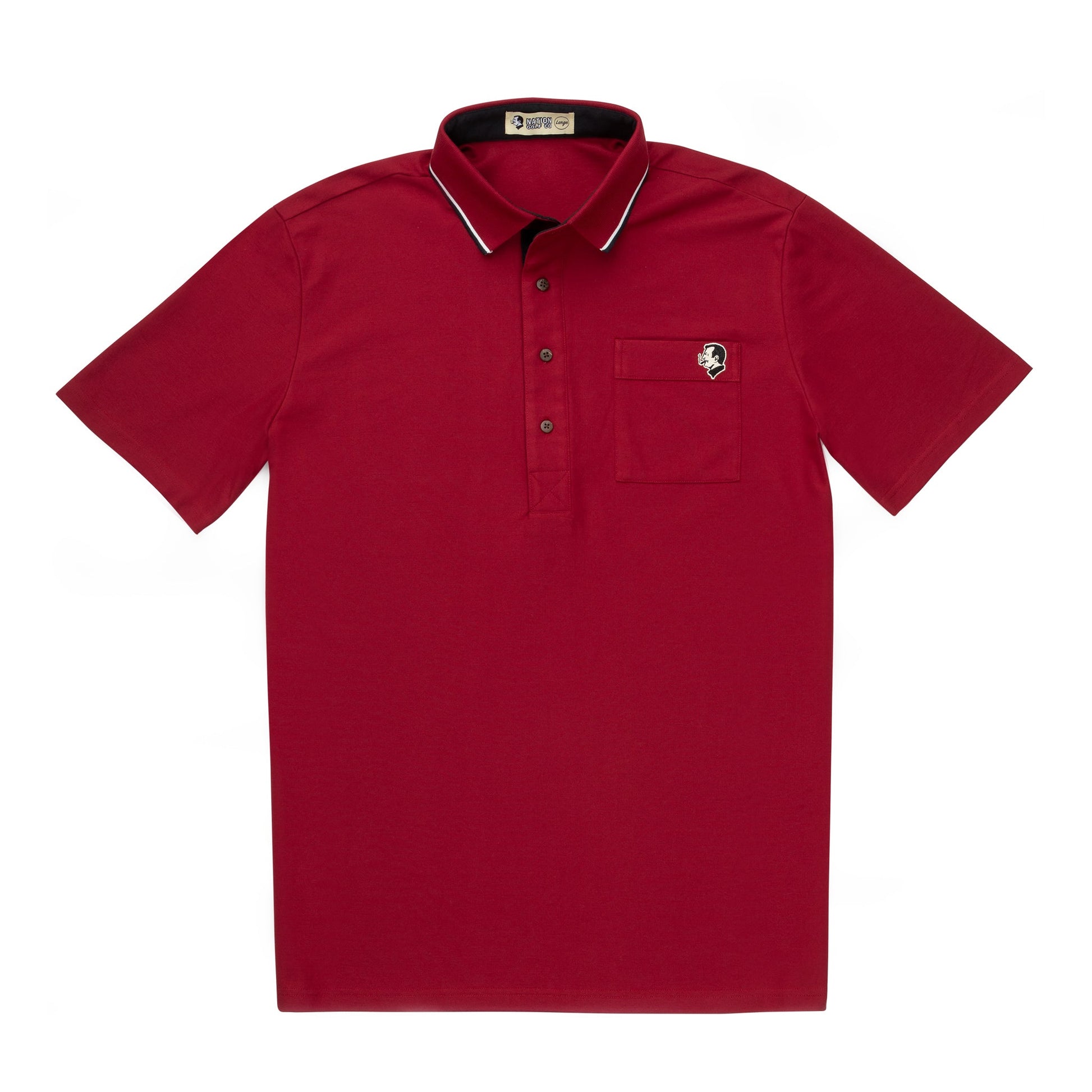 Soft, breathable, 50/50 blend cotton-poly pique. Flexible 1:1 rib collar with dual stripe accents on a contrast collar stand for the classic Nation look. A timeless workhorse of a golf polo.