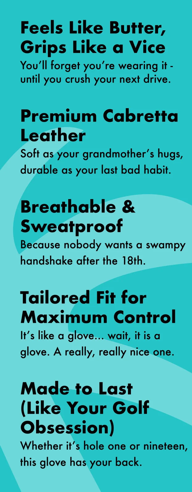 Meet the Vice Grip Golf Glove—your secret weapon to crushing it on the course. Made from luxurious Cabretta leather that feels like your grandma's hugs but has the durability to last through those relentless bogey-saving shots. This glove is tailored for maximum comfort and grip, giving you full control while keeping your hand dry and sweat-free.