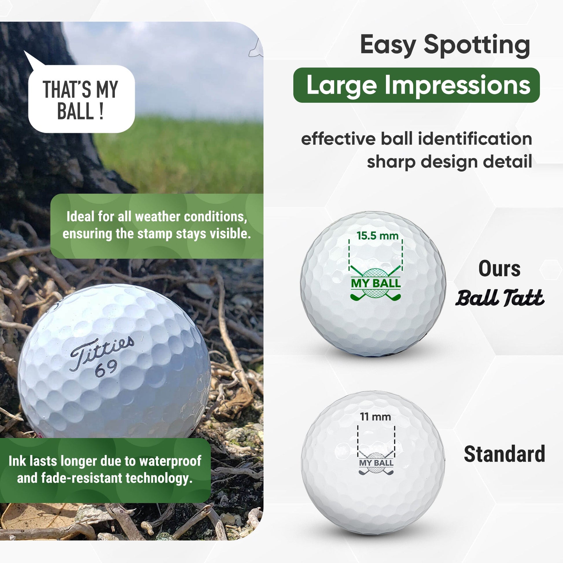 - Bigger, Wider, Easier to Spot: Up to 50% larger & easier to recognize than most golf ball stamps! 0.75” x 0.5” golf ball stamper pad imprints BIG permanent impressions for fast & easy ball identification.