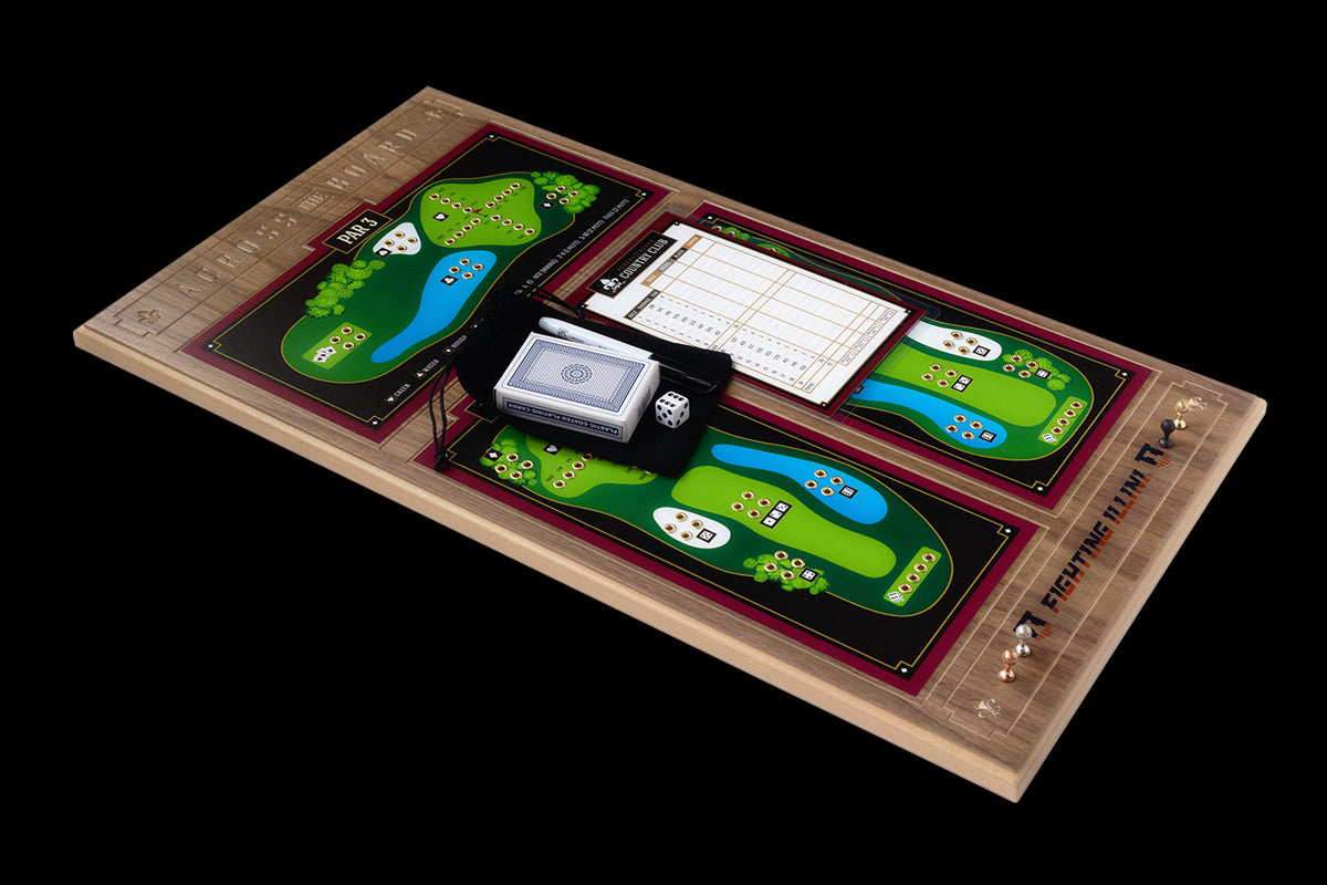 The game is played by rolling the die for tee shots and drawing a card for approach shots toward the green. All players keep score on the provided scorecard. Side games and wagers are included to add even more action. The game board features a Par 3, a Par 4 and a Par 5 which the players complete to finish a 9-hole or 18-hole match.