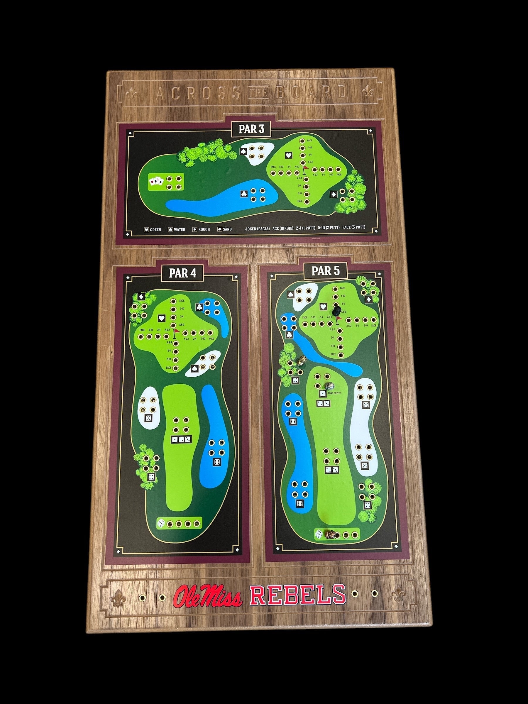 The game is played by rolling the die for tee shots and drawing a card for approach shots toward the green. All players keep score on the provided scorecard. Side games and wagers are included to add even more action. The game board features a Par 3, a Par 4 and a Par 5 which the players complete to finish a 9-hole or 18-hole match.
