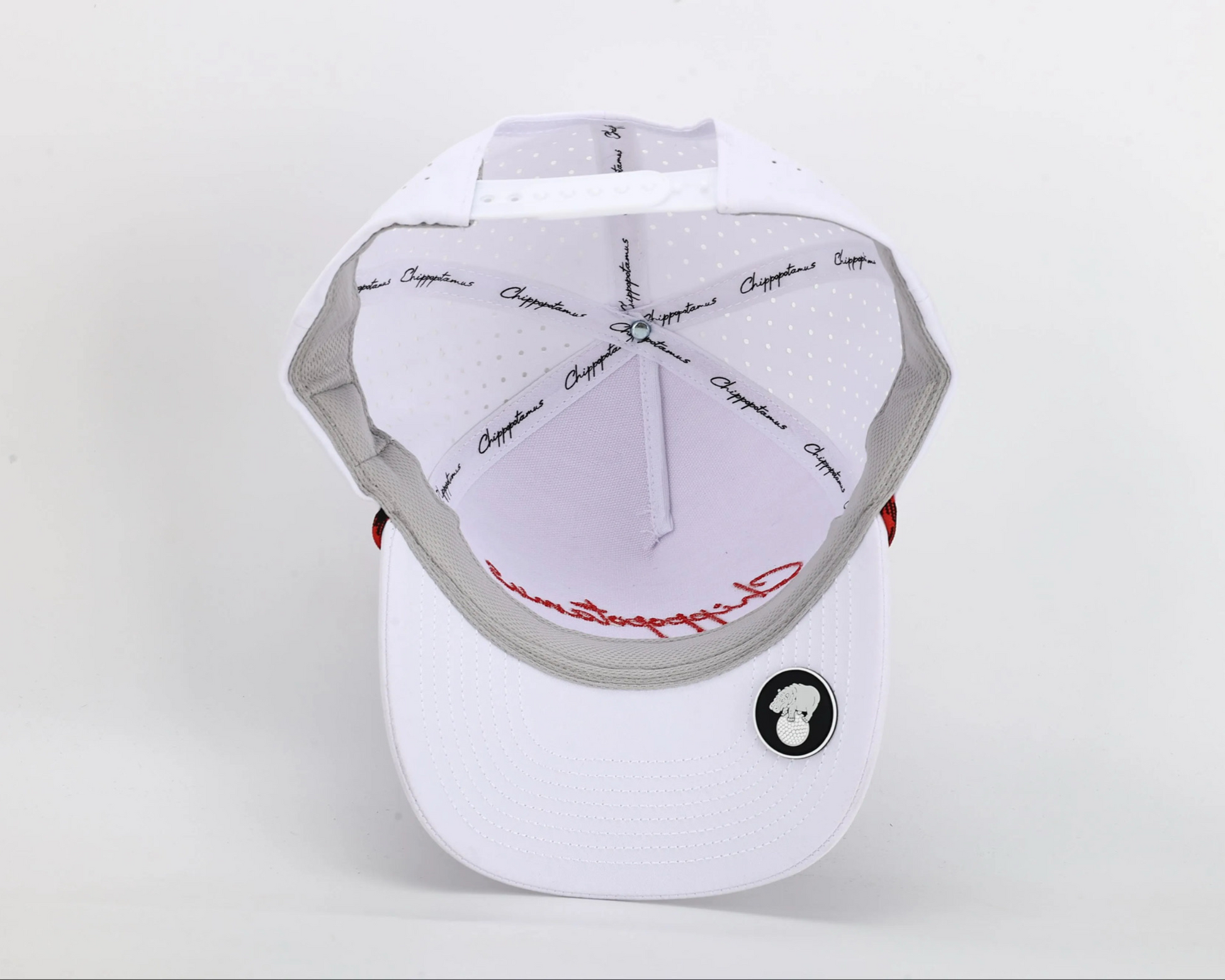 Waterproof material, sweatproof band. 5 panel classic laser cut drilled hole hat in color white with red rope. Embroidered Chippopotamus name in the front and side.
